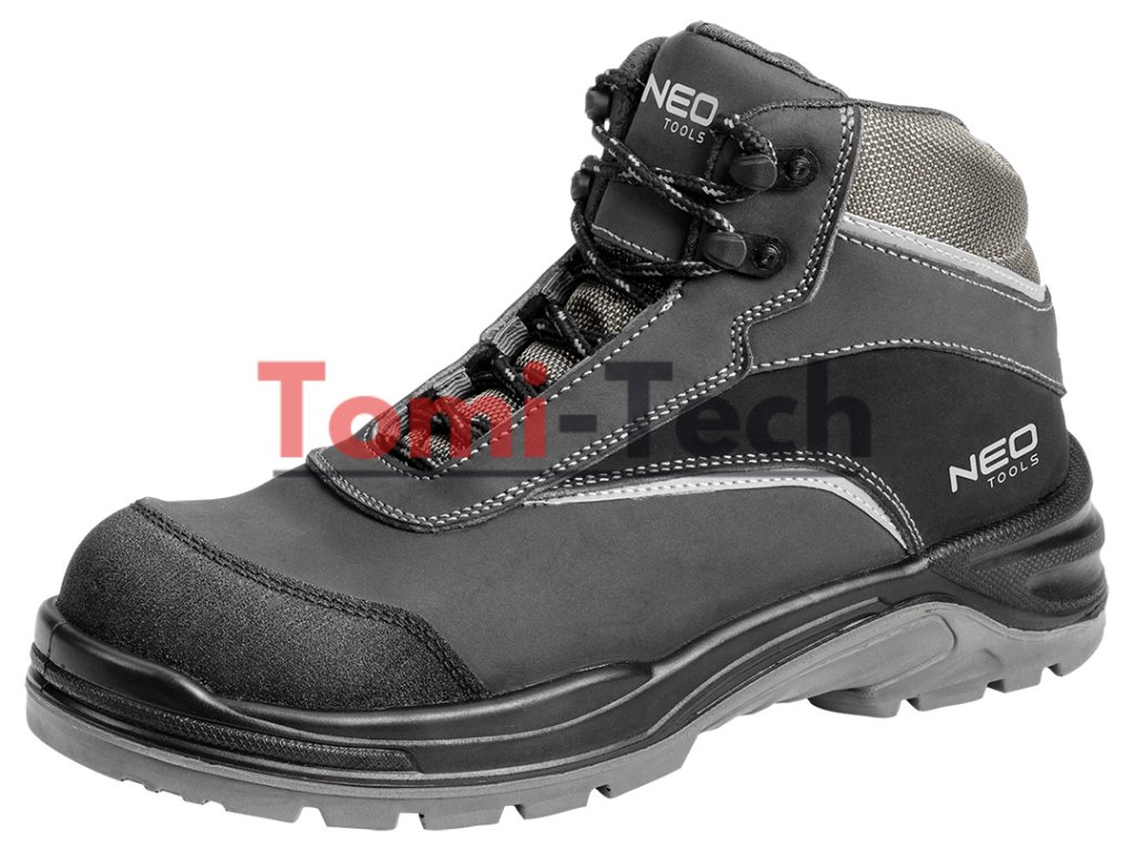 Pracovná obuv S3L SR FO, bez kovových prvkov, veľkosť 44, nubuková, zvýšená odolnosť voči premočeniu a nasiaknutiu, reflexné prvky, protišmyková podrážka s tlmiacim systémom, odolná voči oderu, olejom, benzínu a iným organickým rozpúšťadlám, dvojhustotná PU podrážka, sklolaminátová špička odoláva nárazom až do 200 J, kevlarová stielka proti prepichnutiu, antistatická stielka, šnúrky s votkanou reflexnou niťou, špička zaistená dodatočnou ochrannou vrstvou, päta a jazyk vystužené oxfordskou tkaninou, obuv vyrobená v kategórii S3L SR FO (SR - odolnosť voči pošmyknutiu na keramickom povrchu potiahnutom roztokom laurylsulfátu sodného (SLS) a na oceľovom povrchu potiahnutom glycerolom), certifikát CEDodatočné parametre