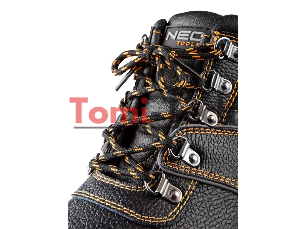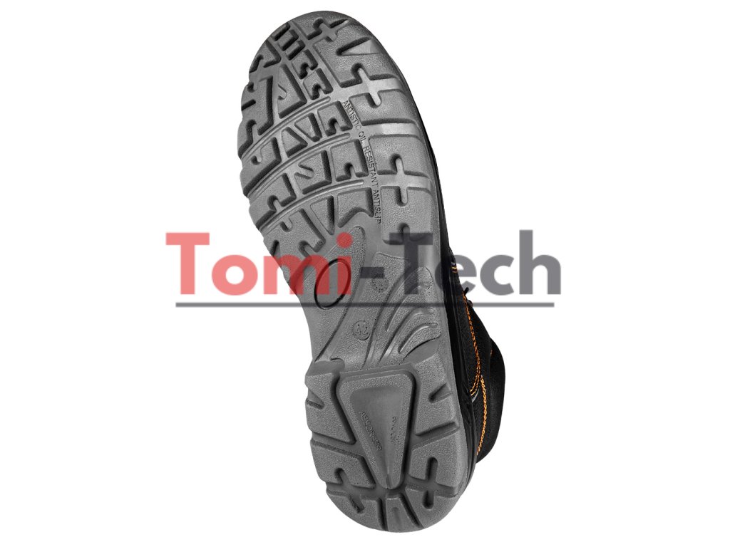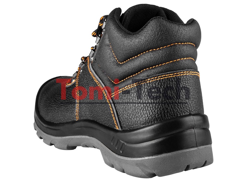 Pracovná obuv, trieda S3 SRC, zvršok z reliéfnej štiepanej kože, kovové pútka, silné jednoduché, dvojité a trojité šitie, oceľová špička poskytujúca ochranu pred nárazmi s energiou 200 J, oceľová vložka proti prepichnutiu, uzavretá päta; dvojvrstvová podrážka; odolnosť voči olejom, benzínu a iným organickým rozpúšťadlám; antistatické vlastnosti; absorpcia energie v oblasti päty; zvýšené parametre odolnosti voči prepichnutiu a presiaknutiu podľa klasifikácie bezpečnostnej obuvi podľa EN ISO 20345, veľkosť 44Dodatočné parametre