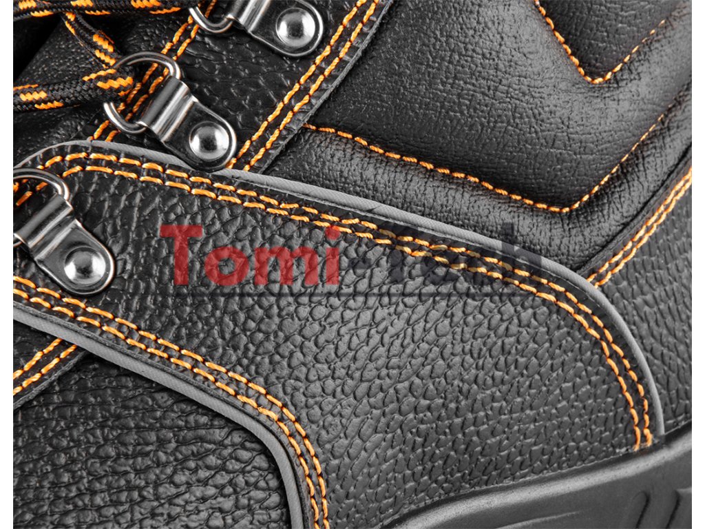 Pracovná obuv, trieda S3 SRC, zvršok z reliéfnej štiepanej kože, kovové pútka, silné jednoduché, dvojité a trojité šitie, oceľová špička poskytujúca ochranu pred nárazmi s energiou 200 J, oceľová vložka proti prepichnutiu, uzavretá päta; dvojvrstvová podrážka; odolnosť voči olejom, benzínu a iným organickým rozpúšťadlám; antistatické vlastnosti; absorpcia energie v oblasti päty; zvýšené parametre odolnosti voči prepichnutiu a presiaknutiu podľa klasifikácie bezpečnostnej obuvi podľa EN ISO 20345, veľkosť 47Dodatočné parametre
