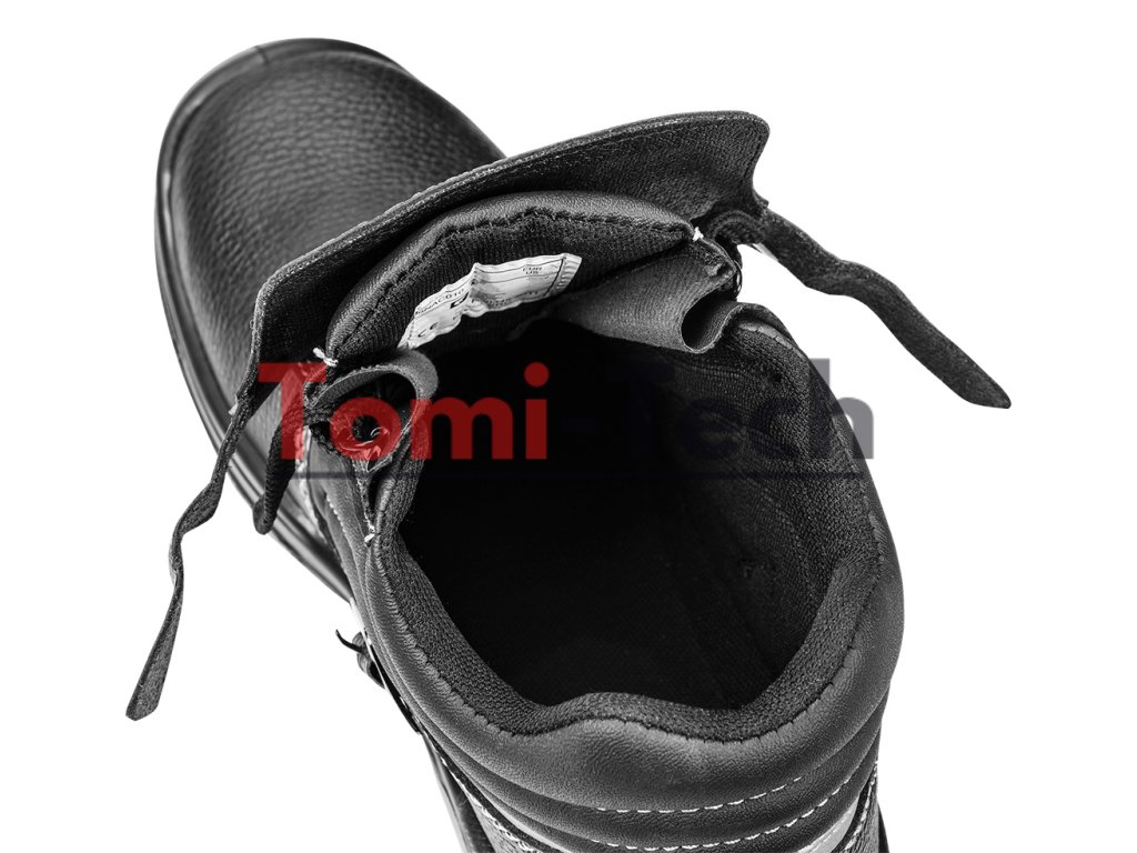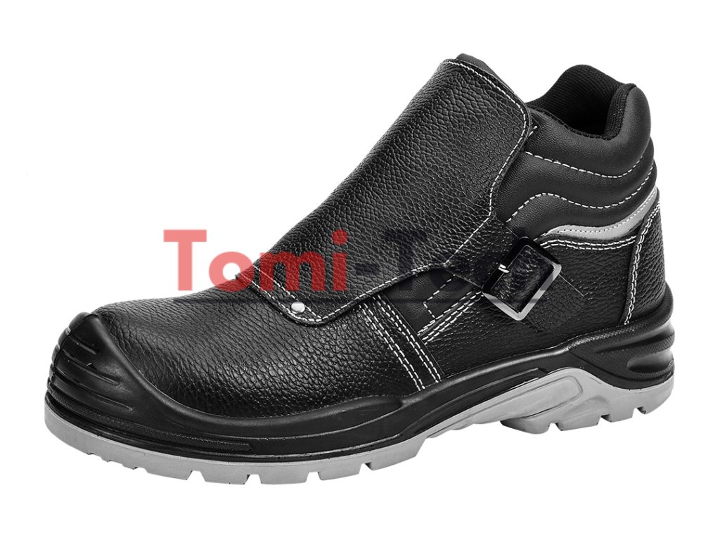 Zváračské topánky S3 HRO, zvršok: reliéfna štiepaná koža, podšívka: pletená sieťovina, dvojvrstvová podrážka: PU/guma, stielka: pena EVA, kovová špička a kovová vložka proti prepichnutiu, obuv vyrobená v kategórii S3 SRC HRO (SRC - odolnosť proti pošmyknutiu na keramickom povrchu pokrytom roztokom laurylsulfátu sodného (SLS) a na oceľovom povrchu pokrytom glycerolom; HRO - odolnosť podrážok voči kontaktu s horúcimi povrchmi), špička poskytujúca ochranu pred nárazmi s energiou 200 J, odolnosť proti prepichnutiu, uzavretá päta, odolnosť voči olejom, benzínu a iným organickým rozpúšťadlám, antistatické vlastnosti, absorpcia energie v pätovej časti, jednoduché a dvojité švy, šnúrkový kryt zapínaný dvoma remienkami s prackami, špička pokrytá hrubou vrstvou gumy na vonkajšej strane, topánky určené na zváranie a prácu s kovom, certifikát CE, veľkosť 41Dodatočné parametre