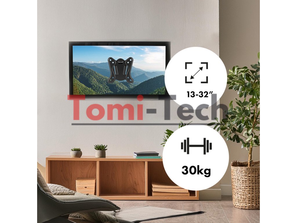 Tento univerzálny nástenný držiak je určený na montáž LCD, LED a OLED televízorov a monitorov rôznych značiek s hmotnosťou do 30 kg a s uhlopriečkou obrazovky od 13" do 32". Nastavenie sklonu umožňuje optimálne umiestnenie obrazovky a zaisťuje najlepší pozorovací uhol.