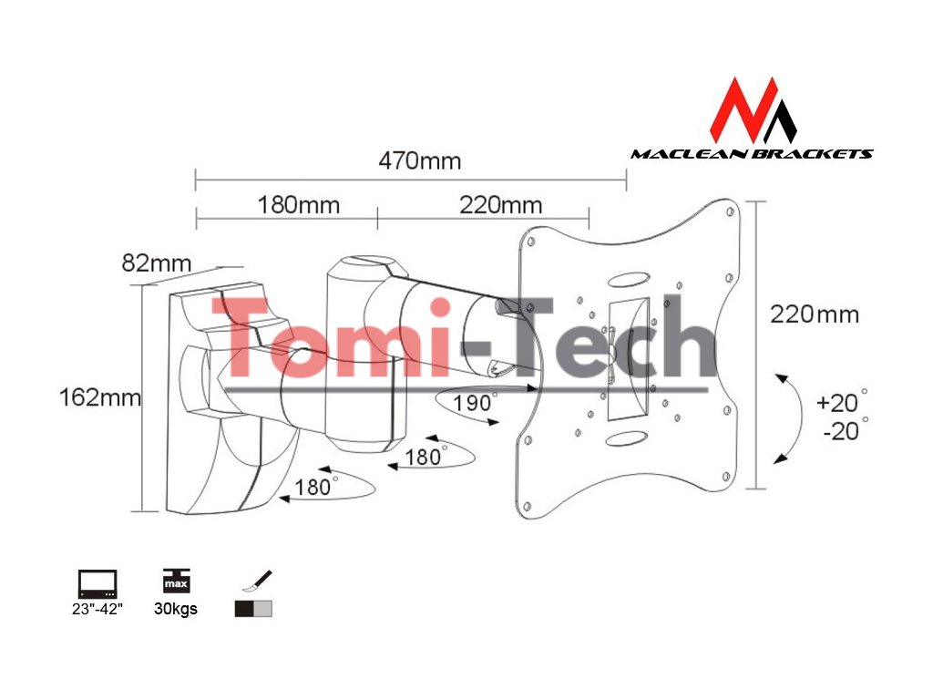 Univerzálny nástenný držiak na upevnenie televízorov a monitorov rôznych značiek s maximálnou hmotnosťou 30 kg a uhlopriečkou obrazovky 23 až 50 mm. Kompatibilný s plazmovými, LED a LCD monitormi a televízormi značiek ako Sony, LG, Samsung, Philips, Sharp, Panasonic, Toshiba, Grundig, Pioneer, JVC, Benq, Sanyo, NEC, Hyundai, Hitachi, Iiyama, ASUS, ACER a Xiaomi.