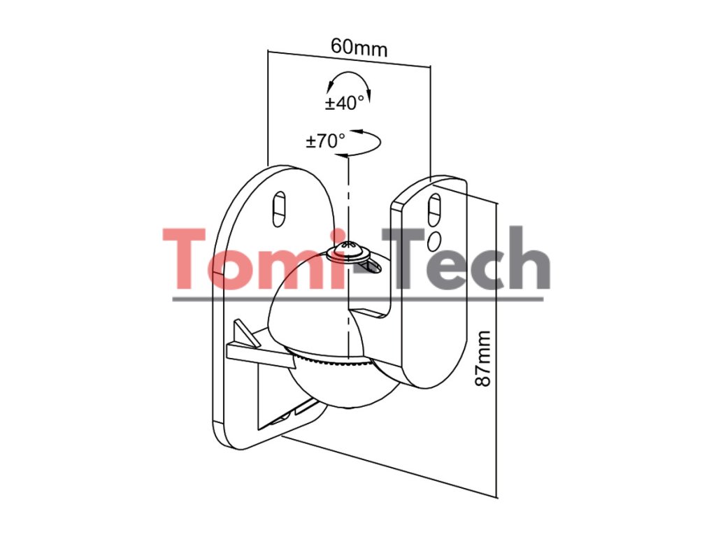 Univerzálny nástenný držiak na montáž reproduktorov s hmotnosťou do 3,5 kg. Umožňuje nastavenie sklonu +/- 20 stupňov a otáčanie reproduktorov +/- 70 stupňov. Vyrobené z vysoko kvalitného plastu.