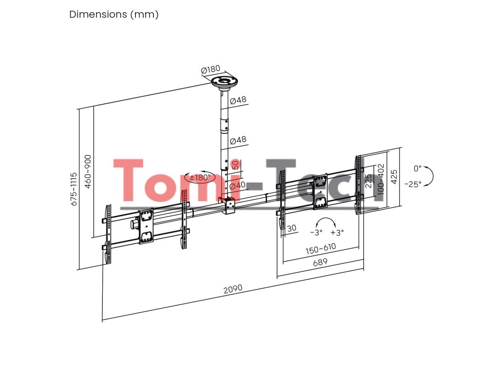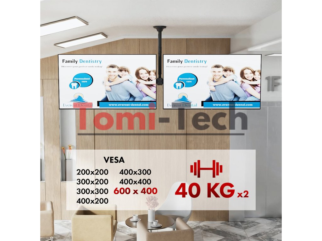 Stropný držiak Maclean MC-111 je navrhnutý na súčasné pripevnenie dvoch televízorov v jednej línii, ktoré sú navzájom dokonale paralelné. Vhodné pre obrazovky s uhlopriečkou od 34 do 60 palcov a s maximálnou nosnosťou každého 40 kg zaisťuje nielen stabilitu, ale aj maximálnu funkčnosť. Kompatibilita upevnenia VESA s rozstupom 600 x 400 mm umožňuje širokú škálu modelov televízorov.