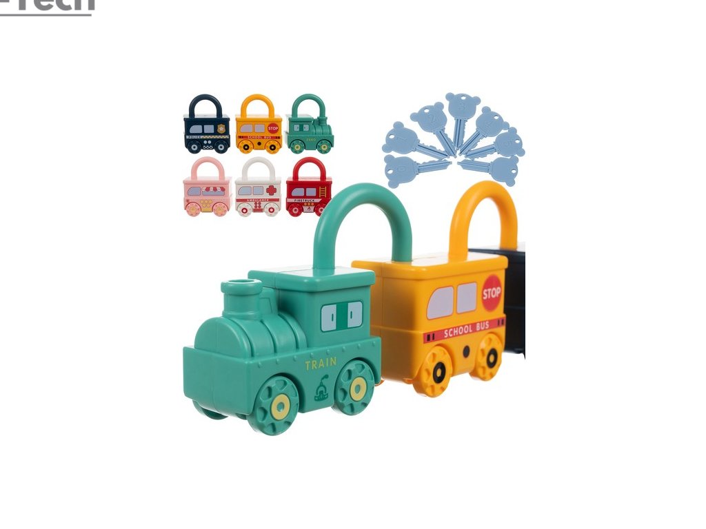 - SADA SO 6 RÔZNYMI AUTÍČKAMI – skladačka s autíčkami je sada pozostávajúca zo šiestich rôznych vozidiel: lokomotívy a piatich vagónov v tvare obdĺžnikových visiacich zámkov. Lokomotíva, označená ako „Vlak“, má na jednej strane nápis: „Nula“ a každé ďalšie vozidlo predstavuje čísla od 1 do 5 a anglické názvy: „Školský autobus“, „Polícia“, „Hasičské auto“, „Sanitka“ a „Zmrzlina“. Vďaka tomu sada nielen rozvíja fantáziu, ale pomáha deťom zoznámiť sa aj s číslami a anglickým jazykom. Autíčka majú na spodnej strane kľúčové dierky, ktorými sa po otočení odomkne visiaci zámok. Horná, odnímateľná časť sa dá otočiť o 360°. KĽÚČE A VISACIE ZÁMKY - Každé autíčko sa dodáva s jedinečným kľúčom, ktorý pasuje iba na jeden visiaci zámok, čo znamená, že deti musia na otvorenie vozidla použiť správny kľúč. Každý kľúč má tvar plyšového medvedíka s dierkou v hornej časti a vygravírovaným číslom od 0 do 5, ktoré pomáha pri učení čísel. Sada navyše obsahuje univerzálny kľúč, ktorým sa dajú otvoriť všetky vozidlá, čo pridáva ešte viac zábavných a vzdelávacích príležitostí. Proces spájania kľúčov rozvíja koordináciu ruka-oko a logické myslenie.