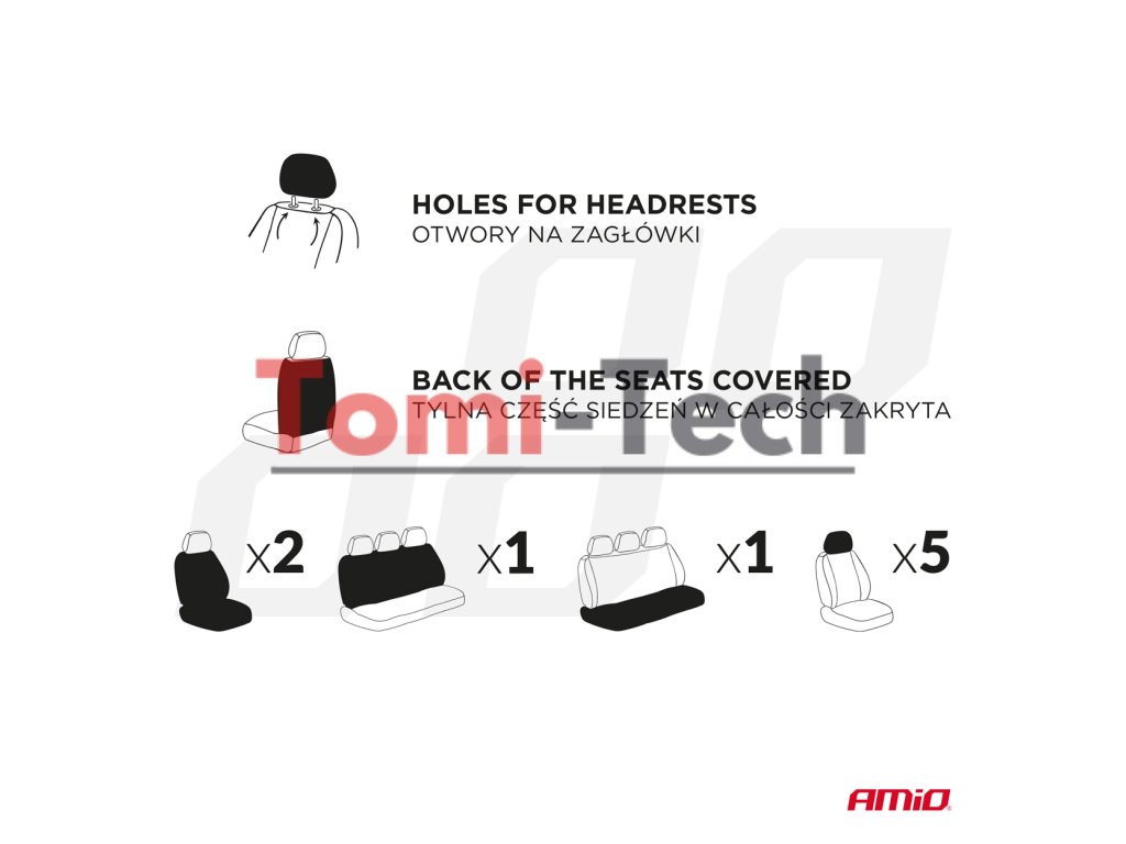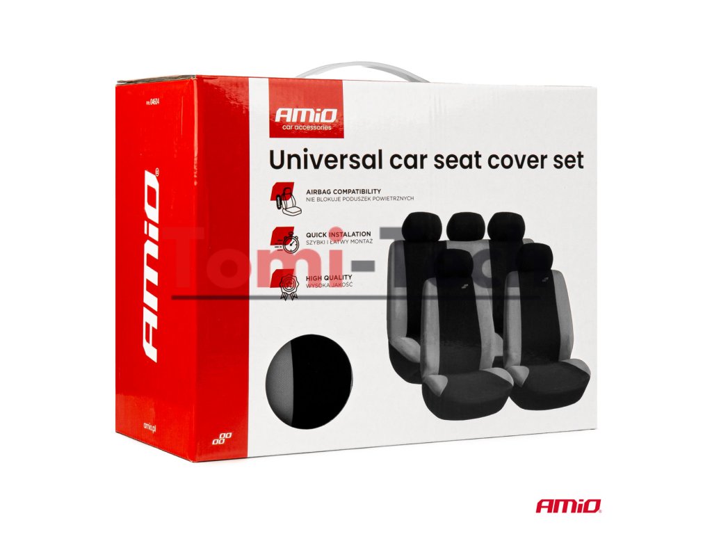 Kompletná sada poťahov na autosedačky pre predné a zadné časti osobného vozidla. Tieto poťahy sú vyrobené z odolného materiálu s vysokou odolnosťou voči oderu a nečistotám a sú kompatibilné so sedadlami s airbagmi – neblokujú ich funkciu. Majú otvory pre opierky hlavy a bezpečnostné pásy. Zadné časti poťahov sú úplne zakryté, čo zaisťuje ochranu celých predných sedadiel, estetický vzhľad a odolnosť.