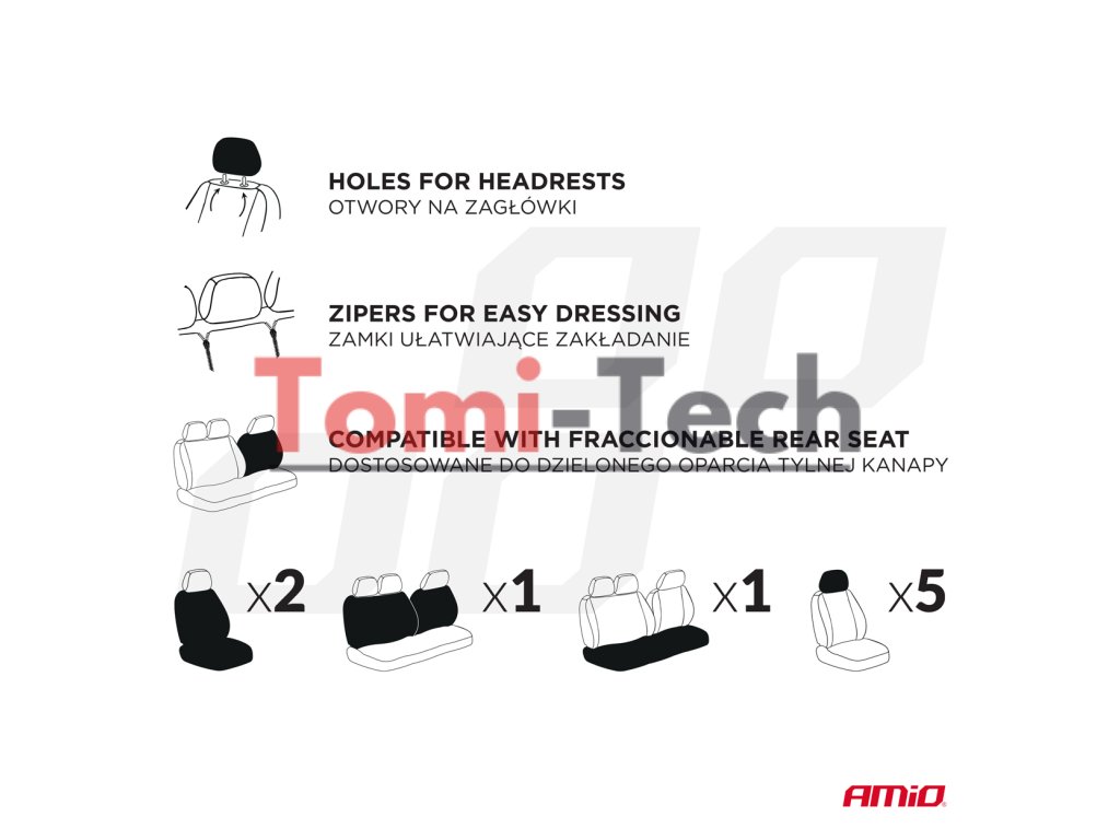 Táto 9-dielna sada obsahuje poťahy na dve predné sedadlá, delené zadné sedadlo a kompletnú sadu opierok hlavy. Univerzálna sada pre väčšinu modelov osobných automobilov.