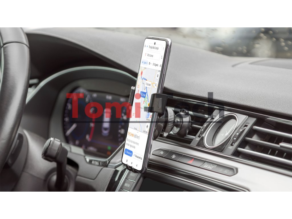 Medzi výhody tohto príslušenstva patrí nastaviteľný uhol sklonu a možnosť otočiť držiak o 360°. To vám umožňuje prispôsobiť polohu telefónu vašim potrebám. Okrem toho má spodný držiak zárez na pripojenie nabíjačky. Toto riešenie určite ocenia vodiči, ktorí sa vydávajú na dlhé cesty.