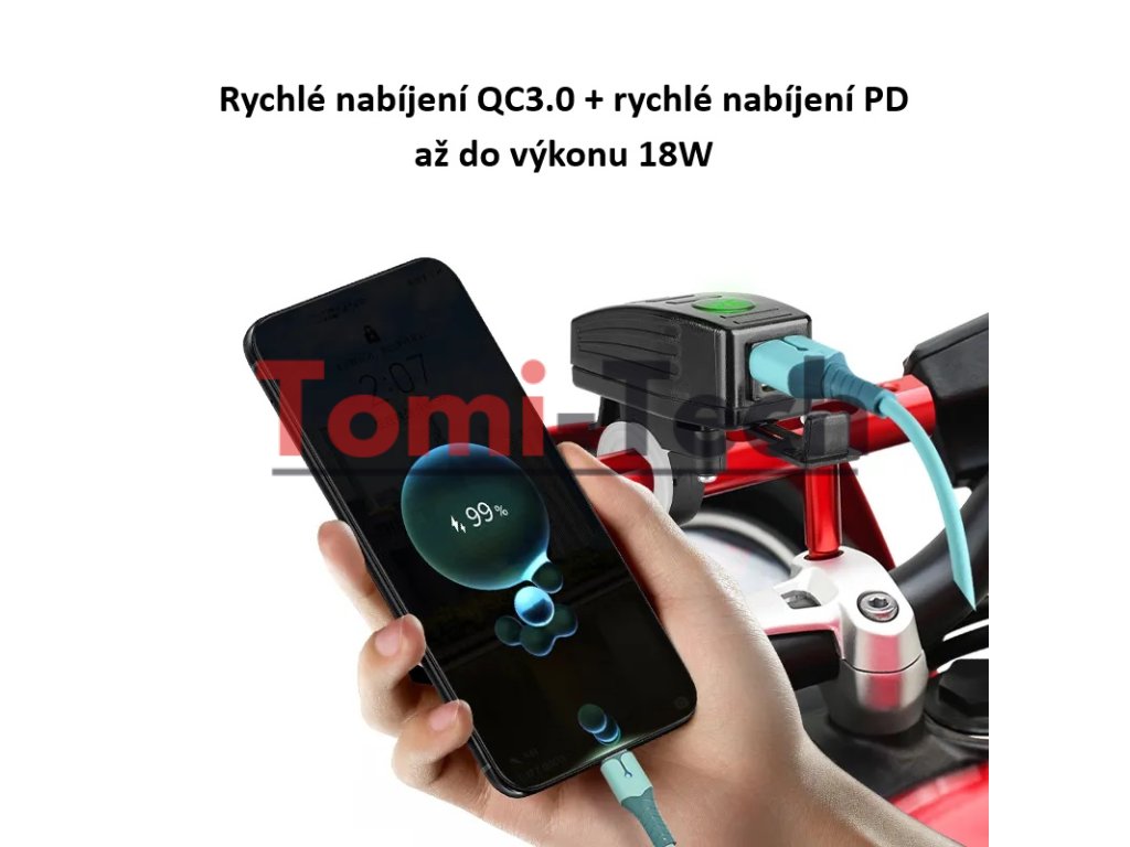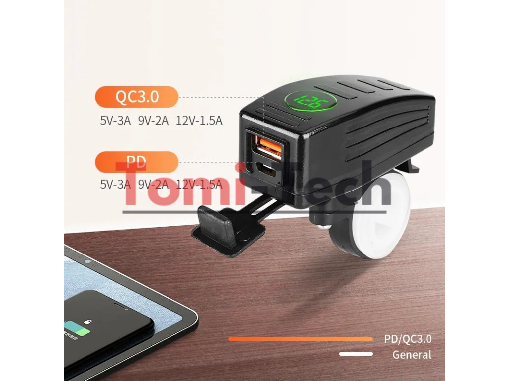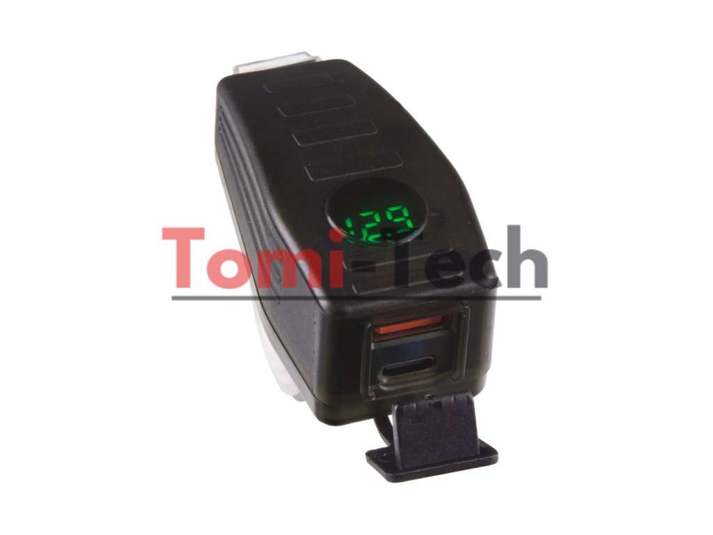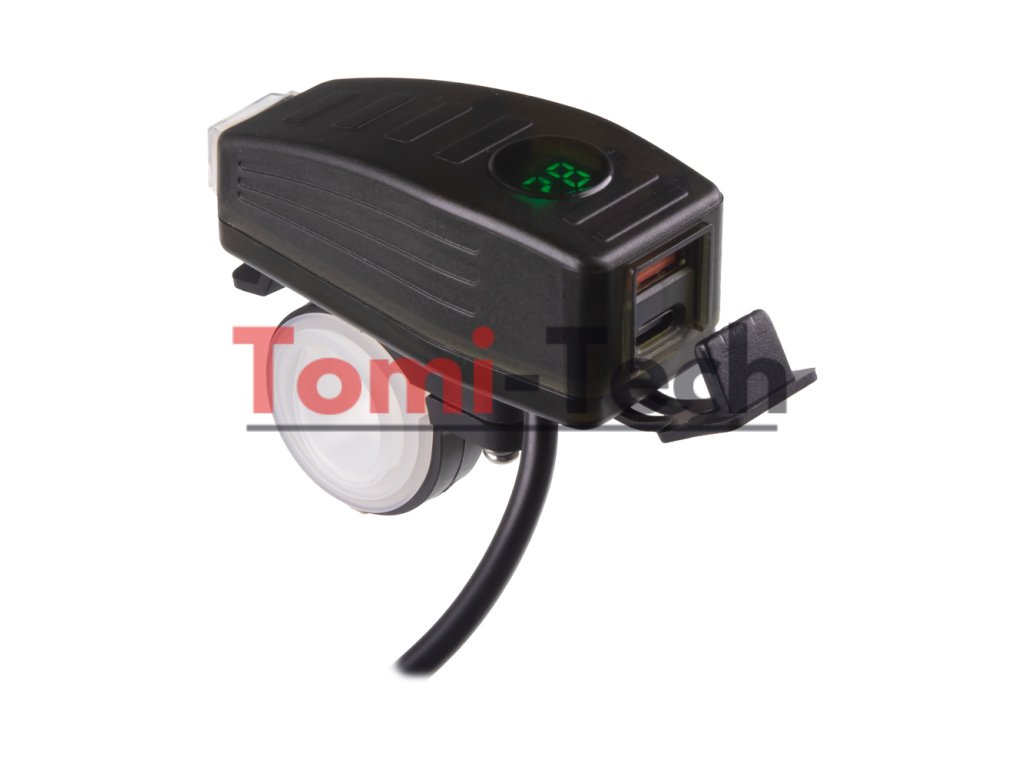 USB/USB-C nabíjačka s voltmetrom na motocykel, vodeodolná krytka, vhodná napr. pre motocykle, štvorkolky a iné.
