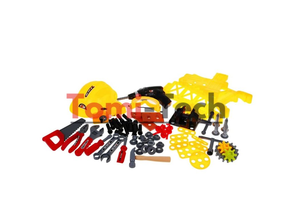 Obsah súpravy pre domácich majstrov:farebný vrták / skrutkovač, realistické kladivo,zlozvyk, praktická píla, potrebné kliešte,dva skrutkovače, štyri kľúče, šestnásť skrutiek, šestnásť prekrytí,štyri kolíky užitočné na zaskrutkovanie, šesť háčikov, potrebný meter,tri prevodové stupne (jeden väčší a dva menšie),ochranné okuliare, maska, prilba,tri kusy dreva na zaskrutkovanie skrutiek,osem plochých prvkov s otvormi na zaskrutkovanie skrutiek.