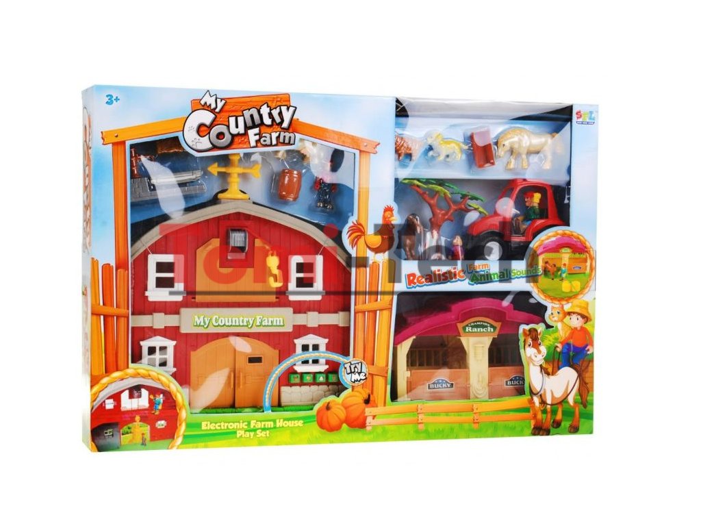 Táto vynikajúca hračka vám umožní vytvoriť si vlastnú jedinečnú, dobre vybavenú farmu so zaujímavým usporiadaním a dômyselnými doplnkami. Gombíky, ktoré vydávajú zvukové efekty v podobe bučania kravy, kokrhanie kohúta, štekanie psa a kvílenie koňa, sú schované pod oknom stodoly.Hračka je napájaná tromi 1,5 V AA batériami - nie sú súčasťou sady.
