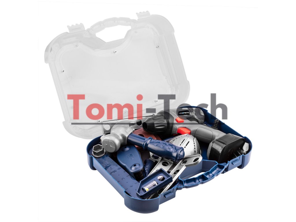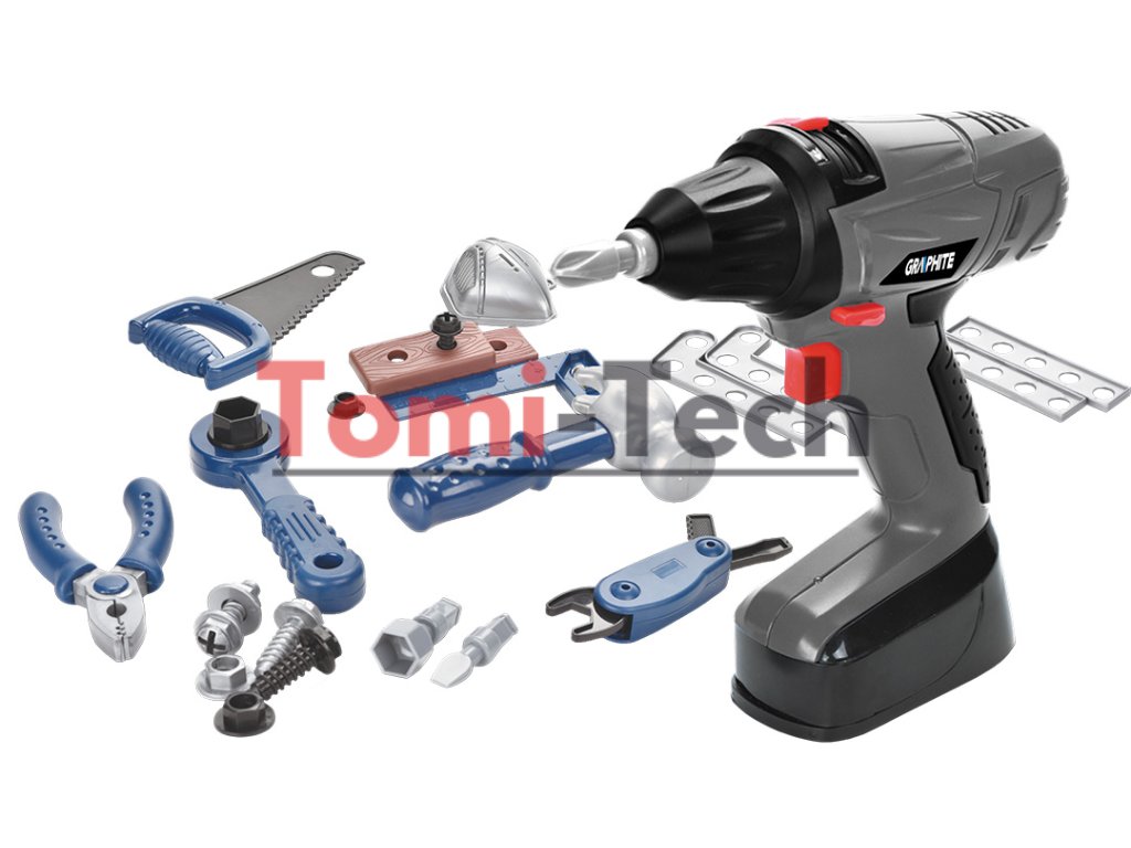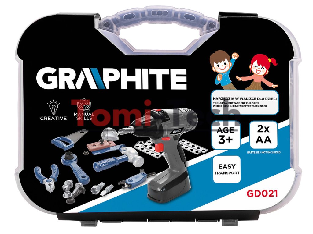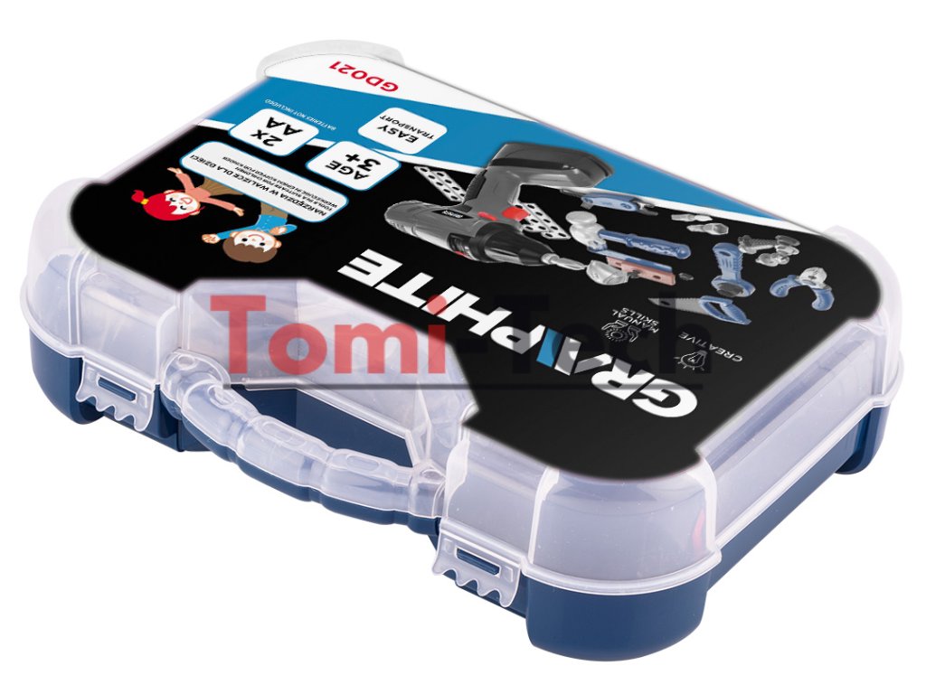 Detský kufrík na náradie, určený pre deti staršie ako 3 roky, sada obsahuje: plastové puzdro, skrutkovač (napájaný 2 AA batériami), ochrannú masku, multifunkčný nástroj, pílu, račňu, uholník, kliešte, kladivo, 2 matice, 2 skrutky, 3 bity, 4 žehličky na skrutkovanie, skrutkovač má ľavú a pravú rotáciu, hmotnosť: 400 g, certifikát CEDodatočné parametre