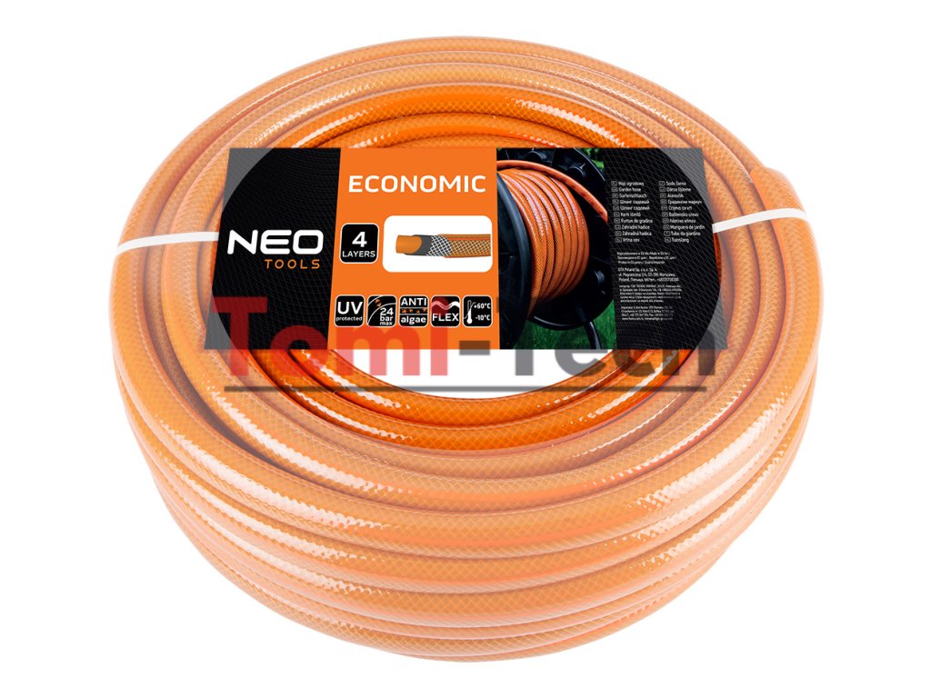Záhradná hadica 1/2" x 50 m, 4-vrstvová NEO ECONOMIC, vyrobená z flexibilného PVC a krížovo opletenej polyesterovej priadze, pracovný tlak 8 barov, tlak pri roztrhnutí 24 barov, odolná voči riasam a UV žiareniu, teplotný rozsah -10°C až +60°CDodatočné parametre