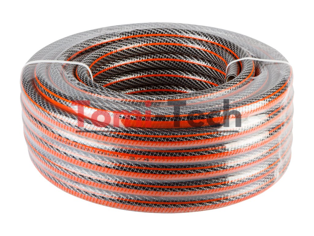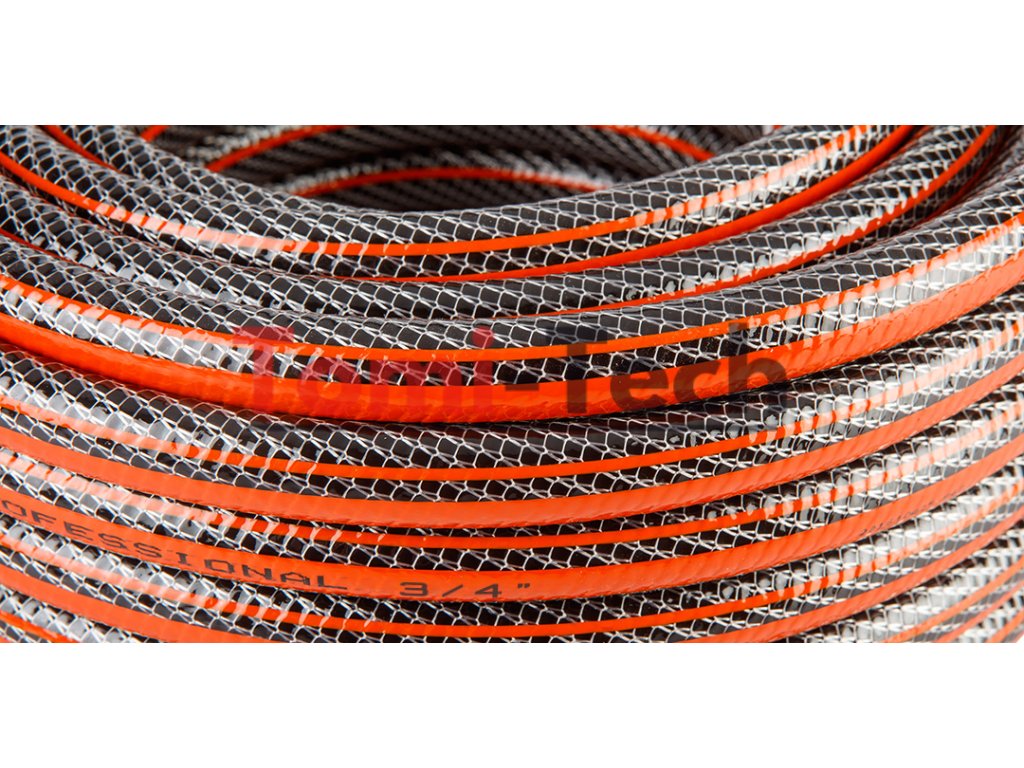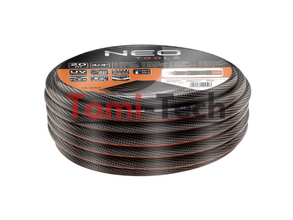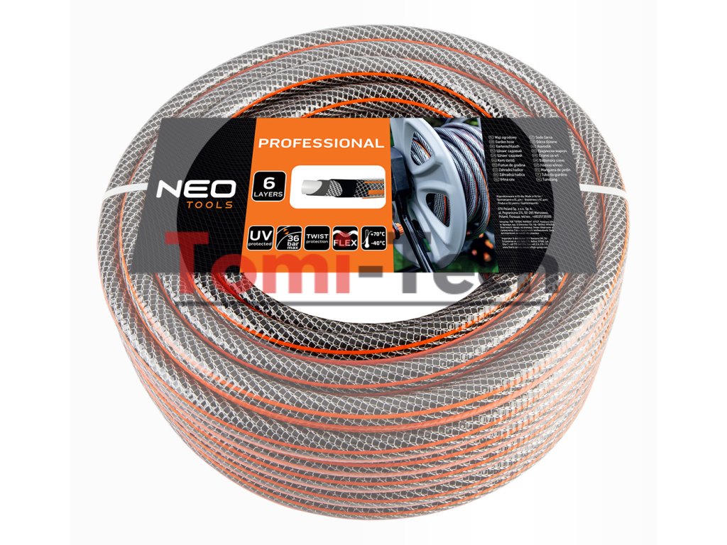 Záhradná hadica 3/4" x 20 m, 6-vrstvová NEO PROFESSIONAL, vyrobená z flexibilnej PVC a polyesterovej priadze s dvoma opleteniami (kríženým a trikotovým), pracovný tlak 12 barov, tlak pri roztrhnutí 36 barov, so systémom proti pretočeniu, odolná voči riasam a UV žiareniu, teplotný rozsah -40°C až +70°CDodatočné parametre