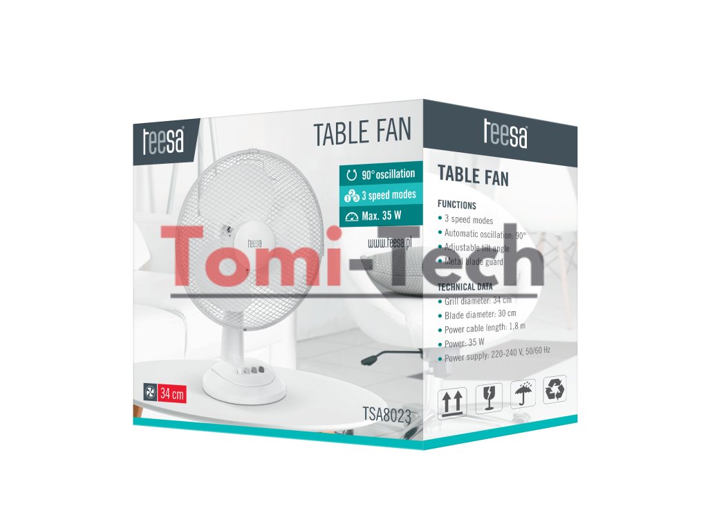 Je horúci letný deň a musíte pracovať niekoľko hodín za stolom na mieste bez klimatizácie? Stolový ventilátor Teesa vám pomôže a rýchlo ochladí miestnosť. Výberom jedného z troch režimov rýchlosti si môžete nastaviť teplotu podľa svojich potrieb. Vďaka malým rozmerom si ľahko nájdete miesto na stole a jeho tichá prevádzka vás počas práce nebude rušiť.Bezpečné a efektívne