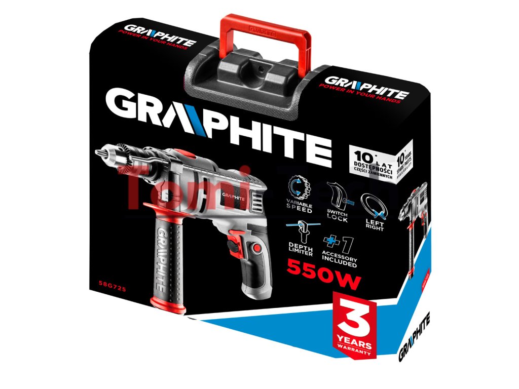 Príklepová vŕtačka 550 W, skľučovadlo 13 mm, otáčky 0 – 3 000 min-1, príklep 0 – 48 000 min-1, pravý/ľavý, maximálny priemer vŕtania do dreva/betónu/ocele 25/13/10 mm, závit vretena x 20 mm, (D x Š) 285 x 205 mm, obmedzovač maximálnych otáčok, gumená hlavná rukoväť, hmotnosť 1,8 kg, príslušenstvo: prídavná rukoväť s úložným priestorom pre vrtáky, doraz hĺbky, 1 ks vrtákov, kufríkDodatočné parametre