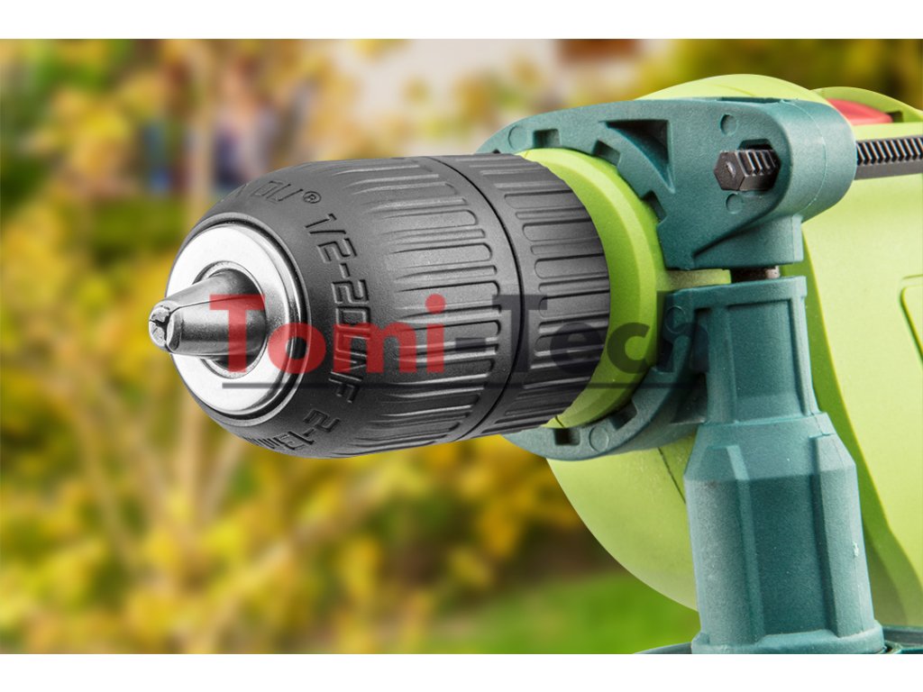 Príklepová vŕtačka 850 W, samosvorné skľučovadlo 13 mm, otáčky 0 – 3 000 min-1, príklep 0 – 48 000 min-1, pravý/ľavý, priemer vŕtania do dreva/betónu/ocele 30/13/13 mm, závit vretena 1/2 x 20 mm, hmotnosť 2,2 kg, príslušenstvo: prídavná rukoväť + príslušenstvoDodatočné parametre