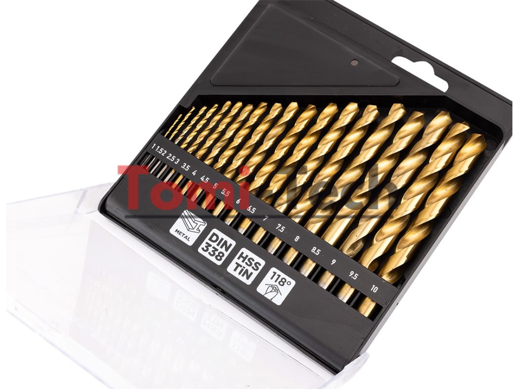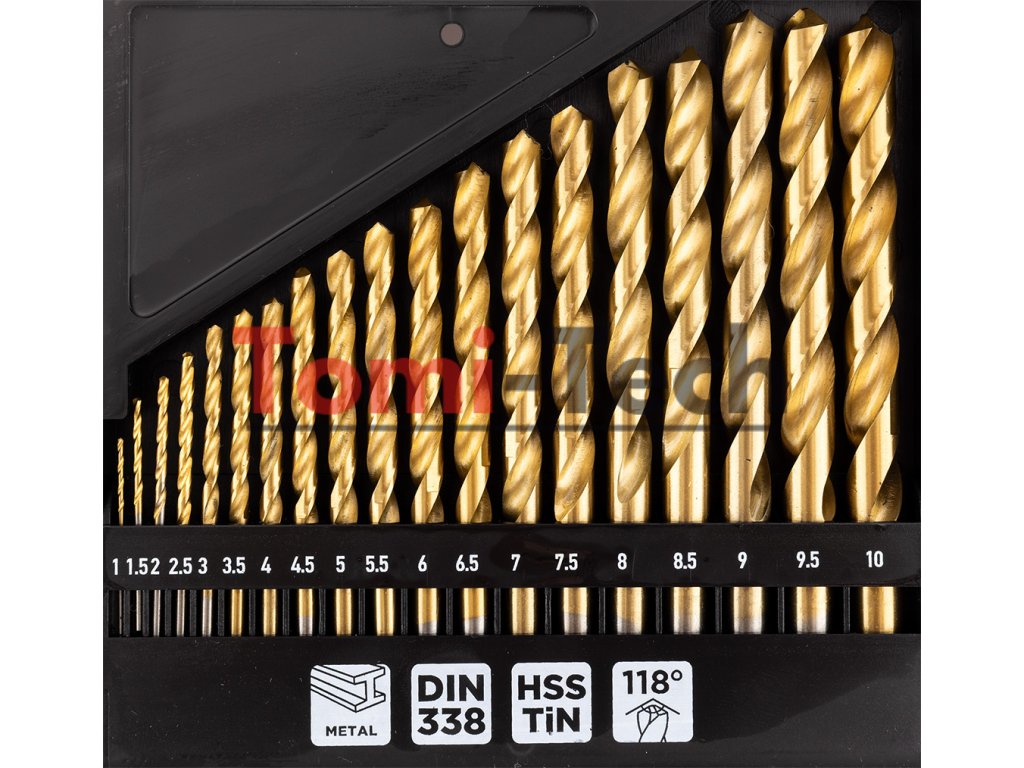 Sada 19 vrtákov do kovu, priemery: 1; 1,5; 2; 2,5; 3; 3,5; 4; 4,5; 5; 5,5; 6; 6,5; 7; 7,5; 8; 8,5; 9; 9,5; 10 mm, vyrobené z rýchloreznej ocele HSS, s povrchovou úpravou TiN, valcová stopka, uhol ostrenia vrtáka 118°, zodpovedá norme DIN 338, Použitie: kov.Dodatočné parametre