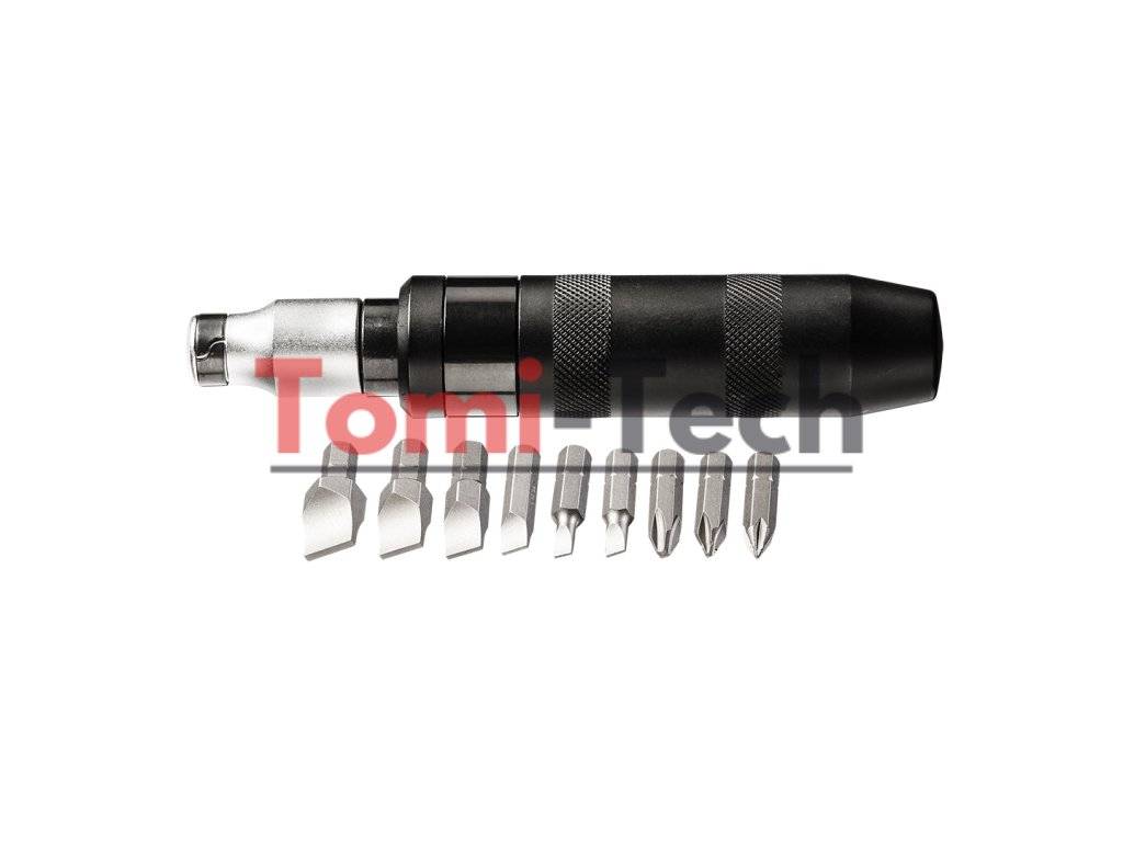 Rázový skrutkovač 1/2", sada 1, rukoväť z CrV ocele, držiak bitov 5, 16" pre 1/2 štvorhran, 10 ks skrutkovacích bitov, veľkosti: ploché 5, 6, 8, 10, 12, 14 mm, krížové PH1, PH2, PH3, plastové puzdro, TÜVDodatočné parametre