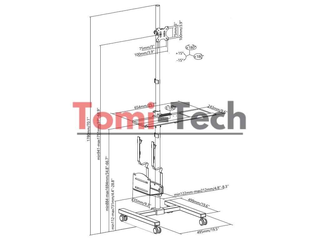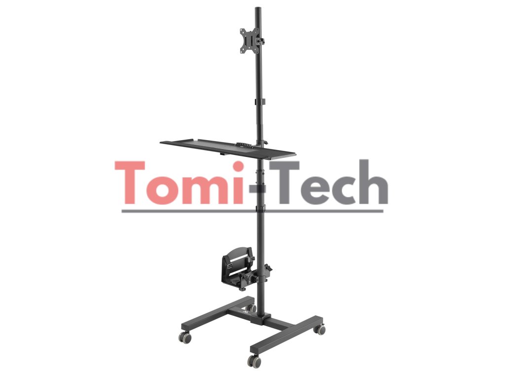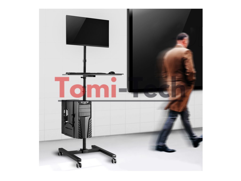 Integrovaný vozík so 4 kolieskami vám umožňuje voľne premiestňovať a zastavovať počítač kdekoľvek v miestnosti. Tento nastaviteľný držiak monitora je vhodný pre monitory od 17" do 32". Je vybavený otočením o 30° a rotáciou o 360°. Ergonomický držiak na klávesnicu je výškovo nastaviteľný, dostatočne veľký na kombináciu klávesnice a myši a pogumovaný dizajn pomáha znižovať namáhanie zápästia. Bezpečný popruh je nastaviteľný tak, aby sa prispôsobil rôznym veľkostiam počítačov a udržal váš počítač na mieste. Dodatočné klipy na správu káblov umožňujú správu káblov, aby sa zabránilo zamotaniu káblov počítača.