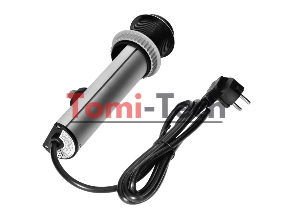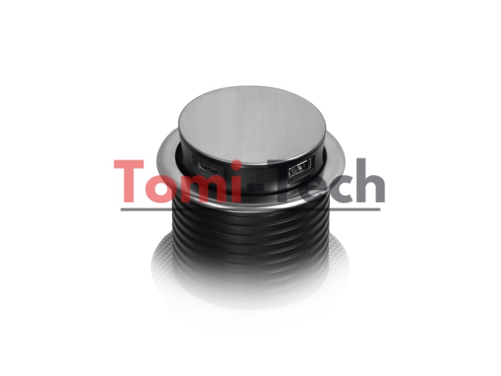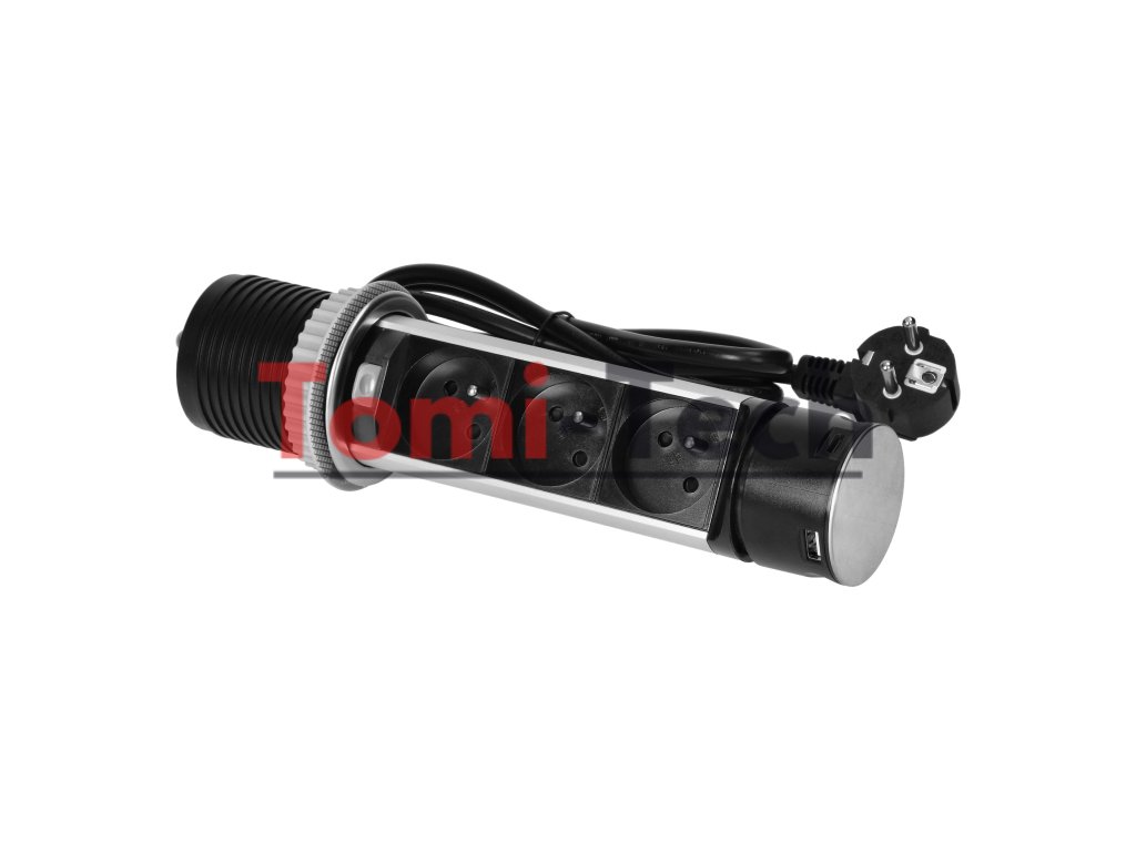 Zapustená nábytková zásuvka Ø6cm s USB nabíjačkou a 1,5m káblom, 3x2P+Z, 2xUSB (typ A a typ C), INOX