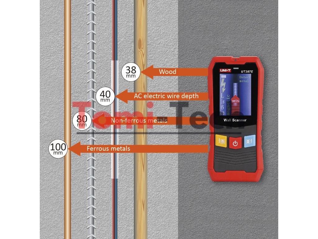 UT387E ponúka všestrannosť pri detekcii rôznych materiálov. Schopnosť detekovať kovové prvky v stenách do hĺbky 100 mm a živé káble AC 110~220 V do hĺbky 50 mm zaisťuje širokú škálu aplikácií. Okrem toho zariadenie efektívne lokalizuje drevené prvky v stenách a ponúka dva režimy detekcie: presný (do 20 mm) a hĺbkový (do 38 mm). Možná je aj detekcia neželezných kovov a medi (>4 mm2), čo zvyšuje funkčnosť a presnosť merania.