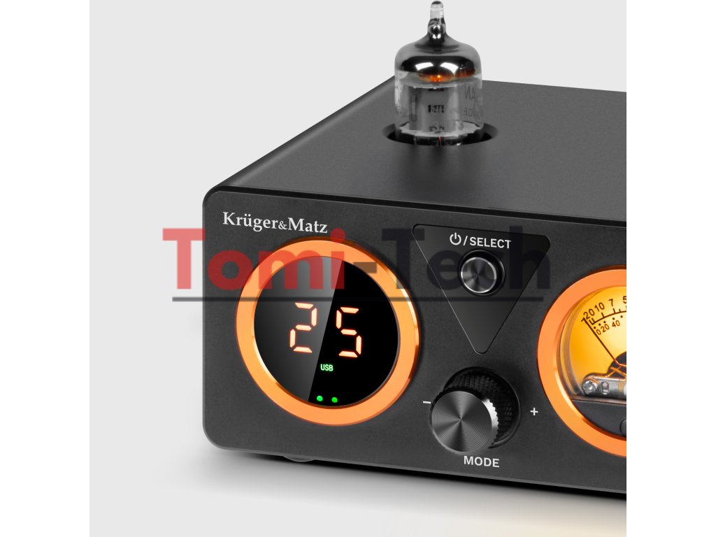 Stereo zosilňovač Kruger&Matz s výkonom 2x100 wattov sa vyznačuje použitím elektrónok JAN5725, ktoré generujú teplý a prirodzený zvuk s veľkou hĺbkou a čistotou.