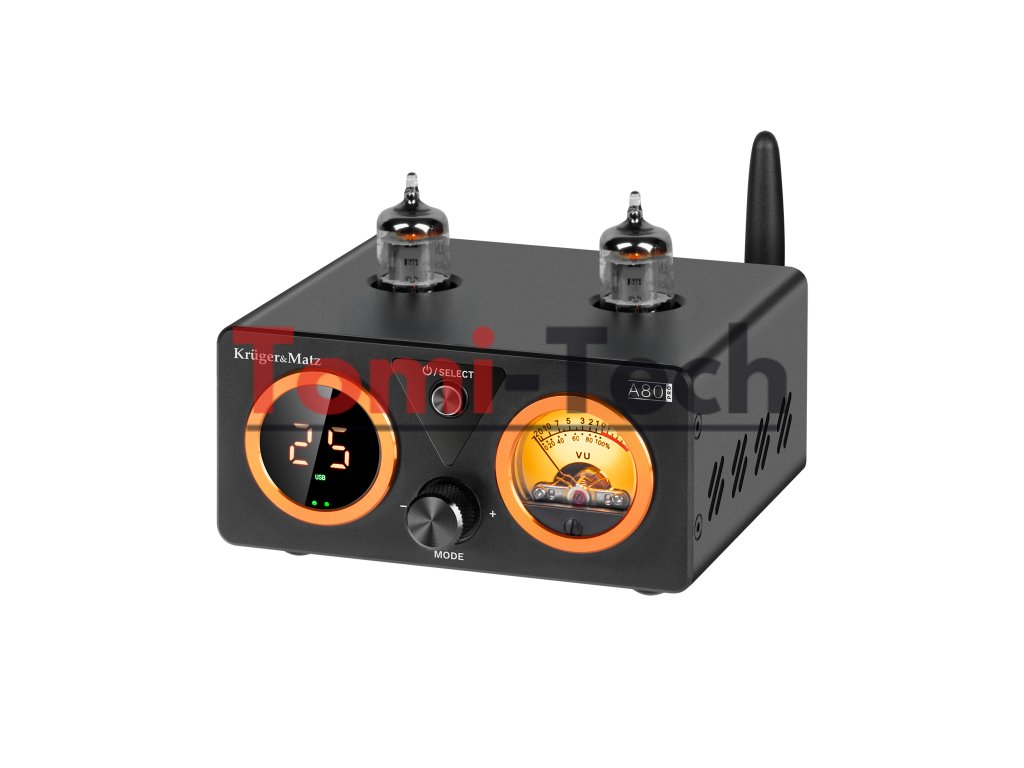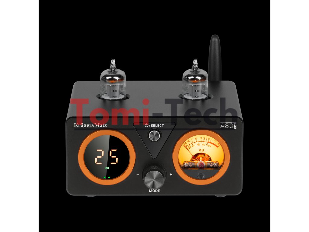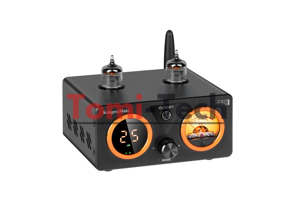Stereo zosilňovač Kruger&Matz s výkonom 2x100 wattov sa vyznačuje použitím elektrónok JAN5725, ktoré generujú teplý a prirodzený zvuk s veľkou hĺbkou a čistotou.