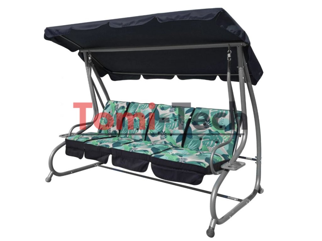 Vlastnosti: Poťah striešky z polyesteru s hmotnosťou 180 g, Rozkladacie komfortné sedátko, 4 samostatné sedátka vyplnené penou, šírka: 6 cm, 2 držiaky na nápoje, Hojdací nadstavec na pružinách, Konštrukcia je vyrobená lakovanej ocele, Vysoká odolnosť proti poveternostným vplyvom, Pevná protišmyková guma na koncoch nôh,Maximálne zaťaženie 300 kg
