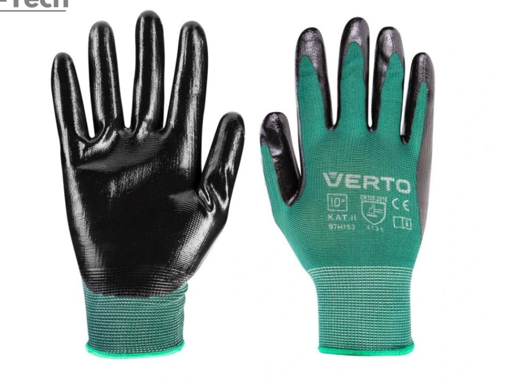 Univerzálne záhradné rukavice VERTO (ref. 97H153) s povrchovou úpravou a nitrilovým povlakom a vyrobené z priedušnej tkaniny. Nitrilový povlak zvyšuje priľnavosť k nástrojom a materiálom. Je úplne nepriepustný pre kvapaliny a chráni pred olejmi, tukmi, tukmi, benzínom a ropnými produktmi. Rukavice majú vysokú odolnosť proti prerezaniu a prepichnutiu a veľmi vysokú odolnosť proti roztrhnutiu a oderu. Dokonalé prispôsobenie umožňuje vykonávať presnú prácu.