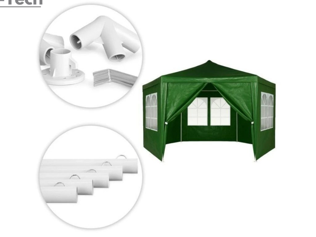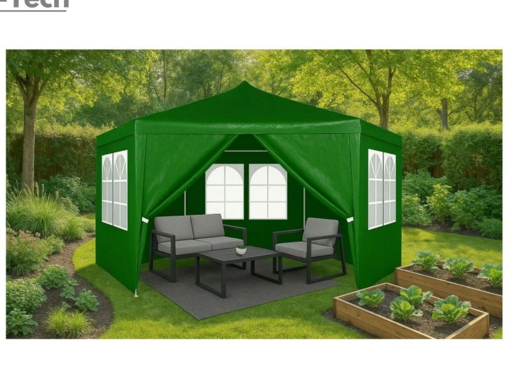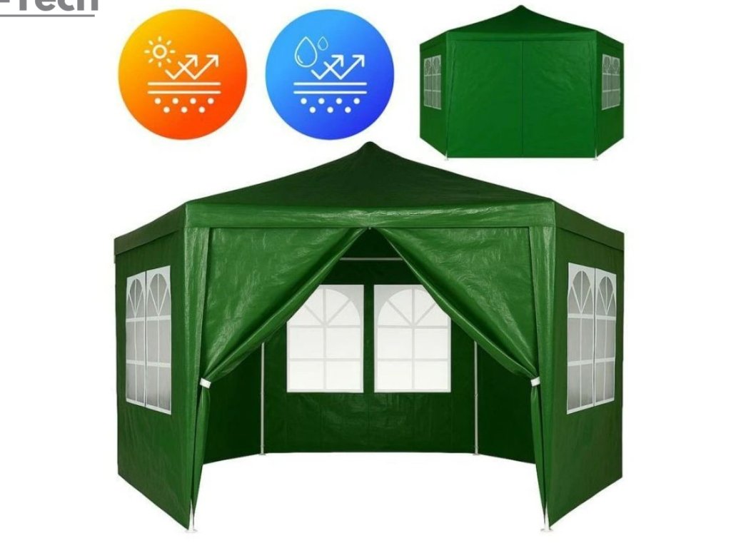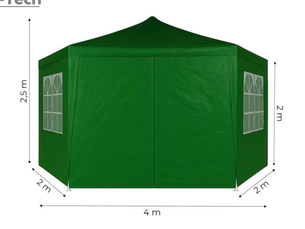 Praktický záhradný stan s rozmermi 2 × 2 × 2 m v zelenej farbe je ideálny na rôzne vonkajšie podujatia, záhradky, chaty alebo gastro priestory. Jeho konštrukcia je vyrobená z hrubých kovových rúrok s priemerom 31/24/18 mm, ktoré sú ošetrené práškovou farbou pre vyššiu odolnosť voči korózii.