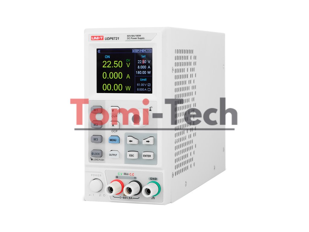UDP6721 ponúka široký rozsah výstupného napätia od 0 do 60 V a prúd 0 až 8 A, s maximálnym výstupným výkonom až 180 W. Vďaka vysokému rozlíšeniu regulácie (10 mV/1 mA v celom rozsahu) umožňuje napájací zdroj presné nastavenie a riadenie parametrov, čo je kľúčové pre pokročilé testovacie aplikácie. Nízke zvlnenie a šum (napätie <5,0 mV rms a prúd <8 mA rms) zaisťujú stabilné napájanie a minimalizujú vplyv rušenia na testované obvody.