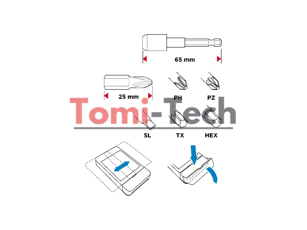 Sada skrutkovacích bitov, 15 ks, oceľ S2, hroty 14 mm - 8 ks, magnetické predĺženie 1 ks.Dodatočné parametre