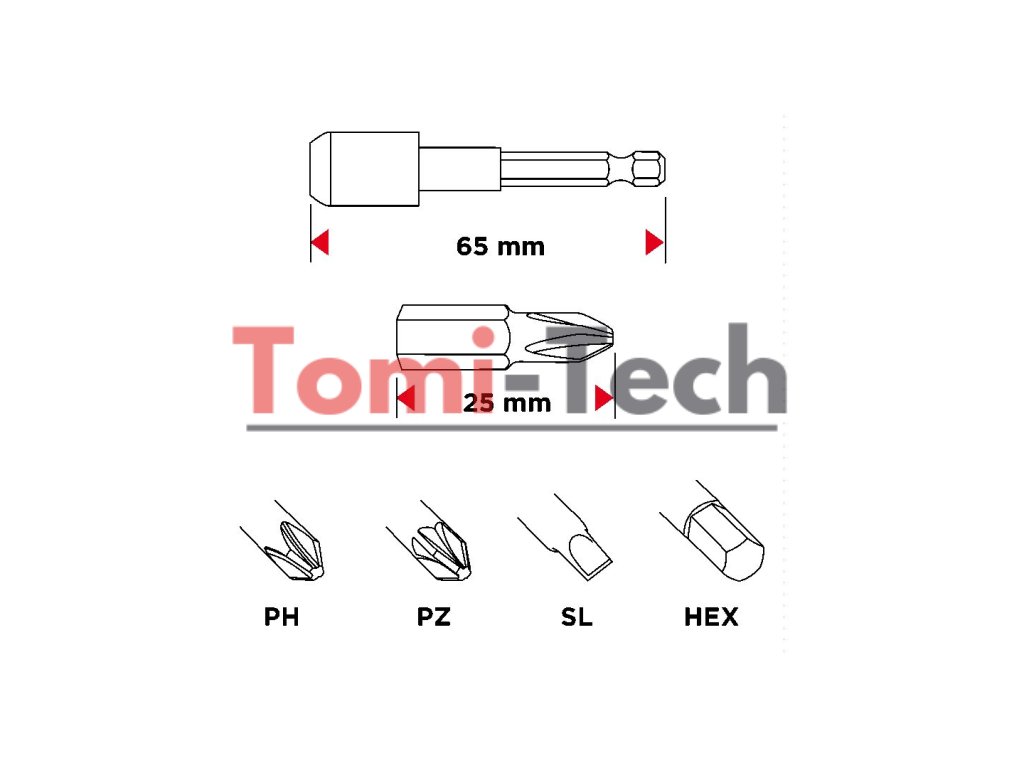 Sada skrutkovacích bitov, 32 ks, oceľ S2, bity 25 mm - 30 ks, adaptér 1/4" - 1 ks, magnetické predĺženie - 1 ks.Dodatočné parametre