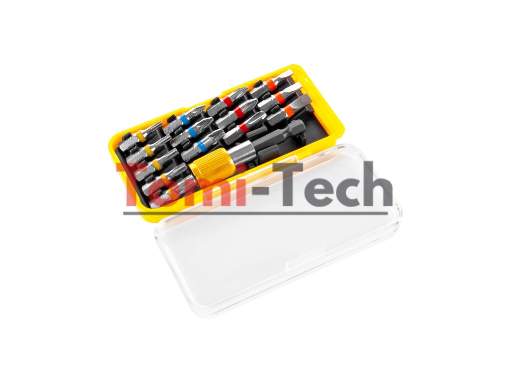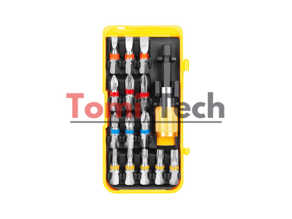 Sada obsahuje aj 14 bitov z chróm-vanádovej ocele, ktoré sú farebne odlíšené pre jednoduchú identifikáciu. Silný magnetický držiak uľahčuje inštaláciu bitov a zaisťuje stabilnú a pohodlnú prácu. Pre väčšie pohodlie pri skladovaní sú všetky prvky súpravy usporiadané v praktickej krabici.