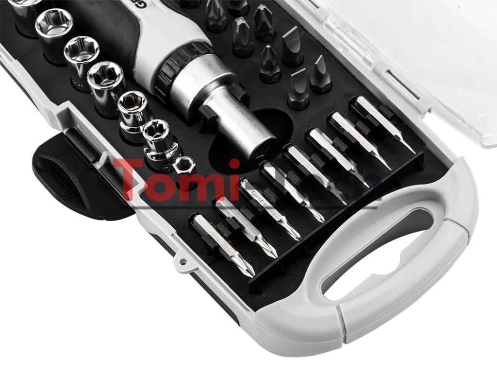 Sada bitov: SL4/5/6, PH1/2/3, PZ1/2/3, TX10/15/20/25 x 25 mm, presné bity: SL1/1,5/2/2,5, PH000/00/0/1 x 28 mm, objímky: H5/6/7/8/9/10, s magnetickým držiakom račne, adaptér z 1/4" šesťhranu na 1/4 štvorhran, adaptér z 1/4" na 4 mm, 30 kusov v sade, oceľ CrVDodatočné parametre