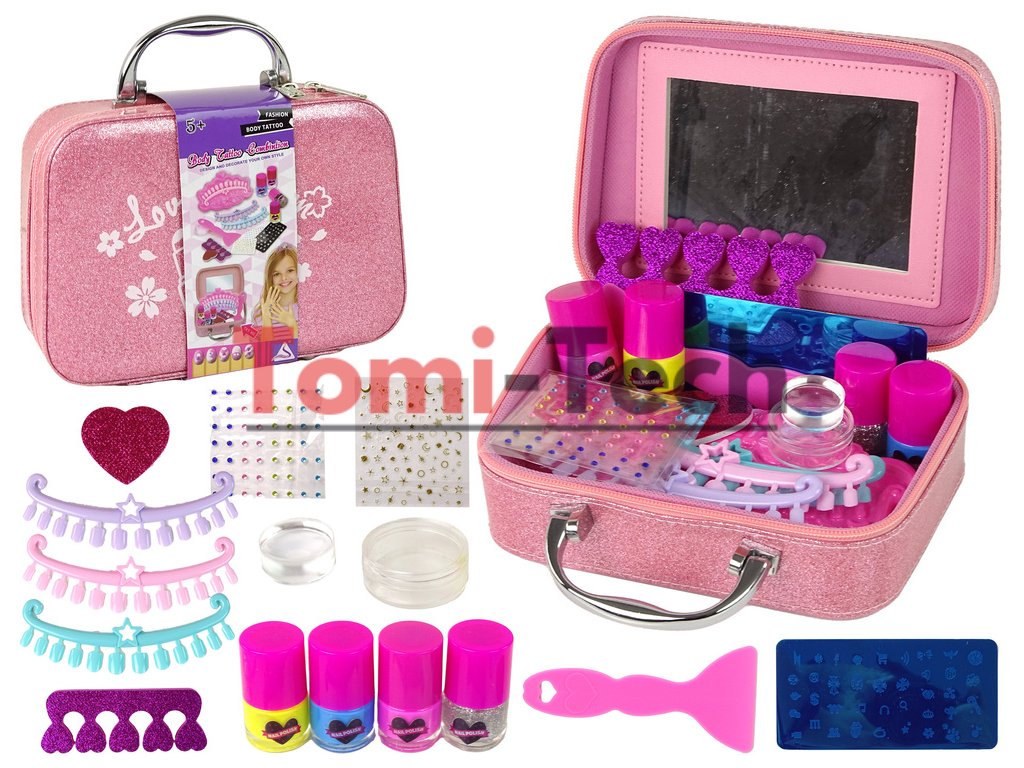 Vo vnútri sa nachádza bohatá sada príslušenstva pre kreatívnu hru a experimentovanie so vzhľadom. Deti nájdu 4 farebné laky na nechty, kozmetický oddeľovač, pilník, tanier so vzormi, špachtľu, 3 šablóny a nálepky na končeky nechtov, pečiatku, nádobku, nálepky a kamienky.