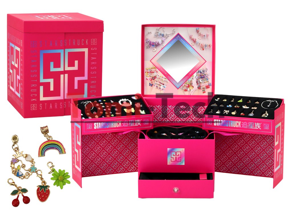 Mimoriadna sada korálok, ktorá vaše dieťa prenesie do sveta nekonečnej zábavy a kreativity. Táto jedinečná sada, zabalená vo veľkej, štvorcovej, ružovej krabičke s pôsobivými rozmermi 26 cm x 23 cm x 23 cm, poteší každého malého umelca. Po otvorení krabičky sa steny krabičky posunú a odhalia tri veľké police, každá naplnená farebnými pokladmi na výrobu šperkov.