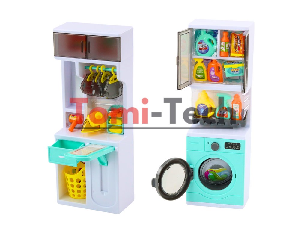 Sada obsahuje realisticky vyrobený sprchovací kút s toaletou s priehľadnými dverami a malý záchod s pohyblivým vekom, ideálny na hranie scén súvisiacich s dennými hygienickými rituálmi. Umývadlo so zrkadlom je štýlovo navrhnuté, so zabudovaným zrkadlom a poličkou na toaletné potreby, ktoré učia deti udržiavať kúpeľňu čistú a upratanú. Práčka so skrinkou obsahuje roztomilú práčku s pohyblivými časťami a skrinkou na prací prostriedok a uteráky, čo podporuje učenie detí o praní a organizovaní oblečenia. Žehliaca doska a police sú praktickým prvkom s mini žehličkou a poličkami na nevyhnutnosti, ideálnym na učenie sa žehlenia a organizovanie priestoru.