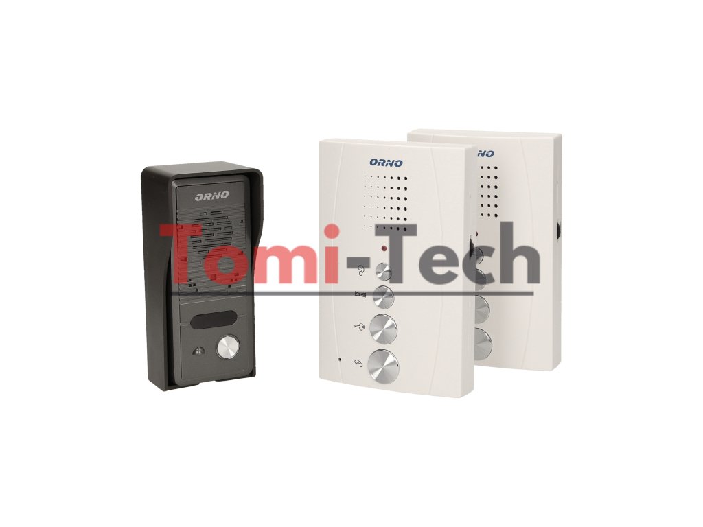 Interkomová súprava pre jednu rodinu s interkomom (komunikácia medzi dvoma domáckymi telefónmi), na omietku, ochranná strieška v cene, bezslúchadlový domácnosť, dodatočné ovládanie brány, dva rôzne vyzváňacie tóny (samostatne pre hovor a interkom), elektrický zámok nevyžaduje dodatočné napájanie.Dodatočné parametre
