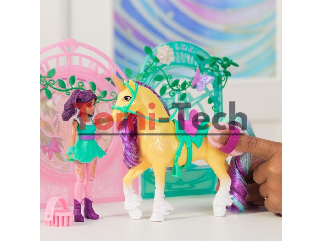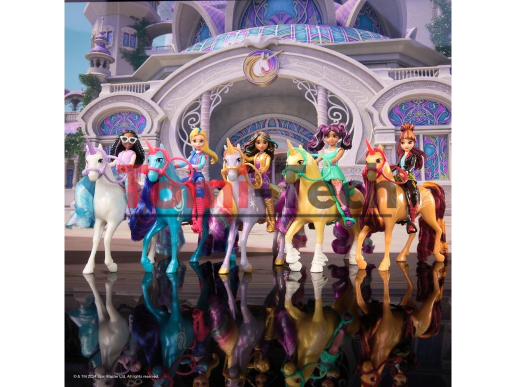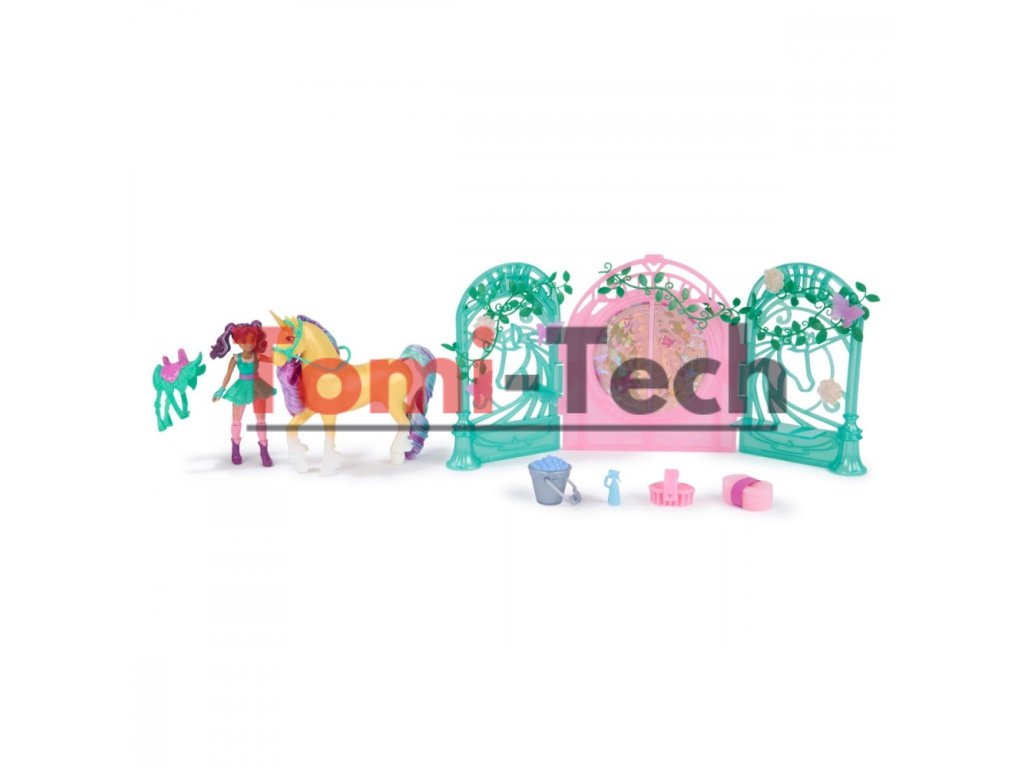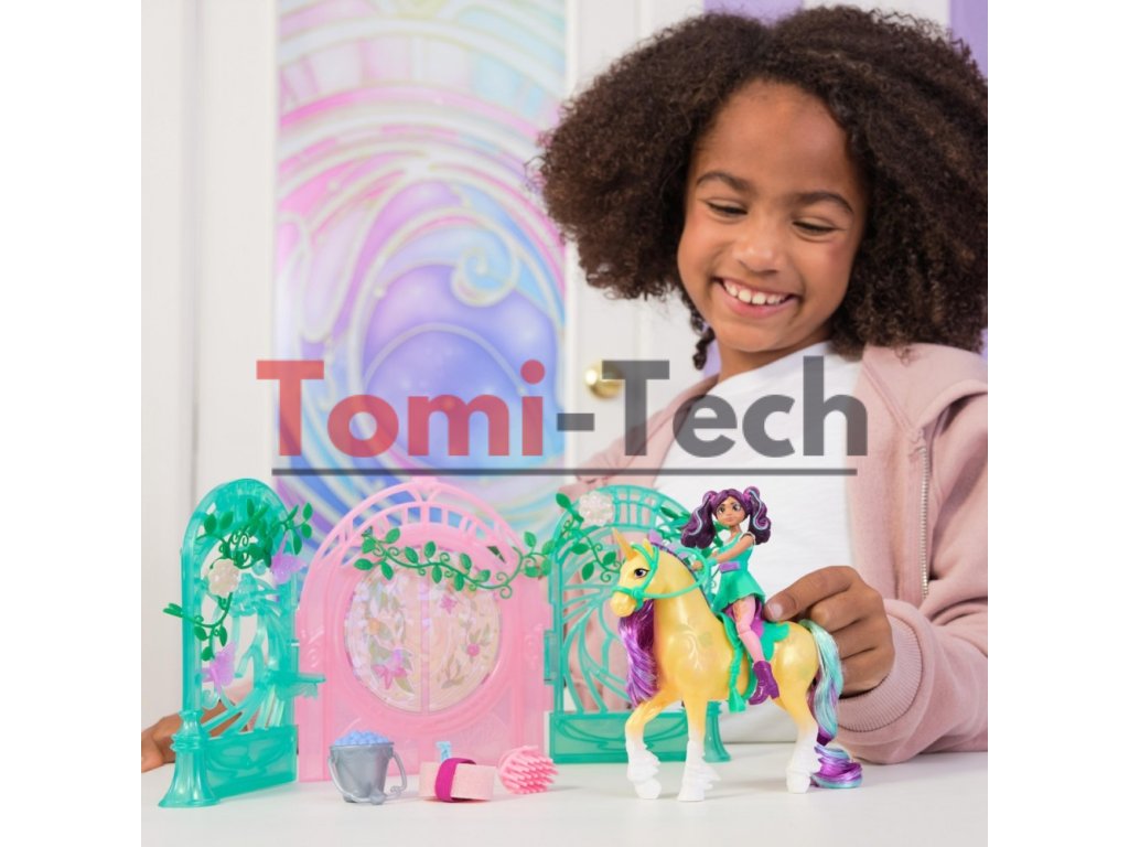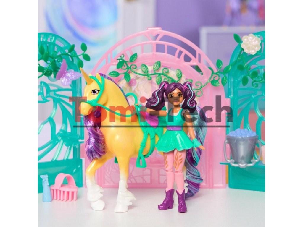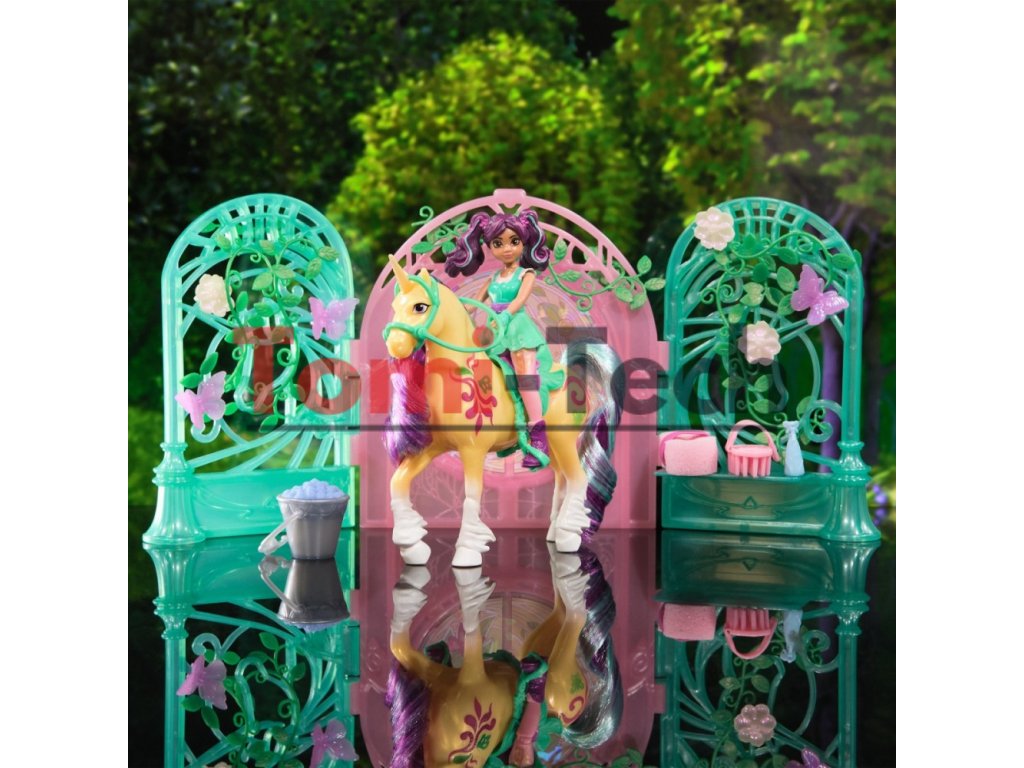 Vytvorte si znovu puto medzi Avou a Leaf z Unicorn Academy s touto sadou v ohrádke. Inšpirovaná animovaným seriálom NETFLIX a obľúbenou detskou knižnou sériou, kde priateľstvo vládne, táto sada podnieti fantáziu k nekonečnému rozprávaniu príbehov. 11 cm Ava, 12 cm List meniaci farbu, 15 doplnkov a verne reprodukované detaily vrátane vitrážového okna na stene ohrádky robia z tejto sady nevyhnutnosť. Umiestnite Avu, aby znovu vytvorila scénu, v ktorej Leaf získava svoje schopnosti. Namočte ošetrovaciu špongiu do ľadovej vody a aplikujte ju na Leaf, aby ste odhalili jej rastlinné magické znaky. Pridajte vedro s rybkou Cloudfish, rozprašovač a motýle, kvety a popínavé rastliny na ozdobenie ohrádky. Pri úprave srsti odstráňte Leafy sedlo a uzdu a potom použite kefu na úpravu srsti, aby ste udržali jej fialovú a tyrkysovú hrivu a chvost lesklé. Ak chcete zažiť viac Unicorn Academy, pozrite si ďalšie malé bábiky vrátane Sophie, Layly, Isabel, Valentiny a ich jednorožcov (hračky sa predávajú samostatne) a rozšírte si tak svoj svet. Pre deti, ktoré milujú jednorožce, hračky s koňmi, bábiky a doplnky, domčeky pre bábiky, zberateľské predmety, plyšové zvieratká a ďalšie, sú hračky Unicorn Academy zábavnými darčekmi k narodeninám pre dievčatá alebo darčekmi na akúkoľvek príležitosť. Zažite dobrodružstvá v Unicorn Academy so sadou darčekov Ava a Leafy.