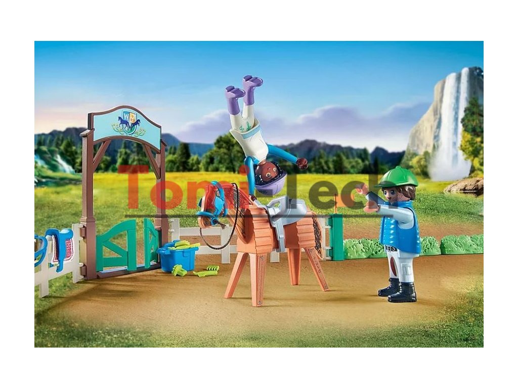 V jazdeckej aréne Waterfall sa môžete dozvedieť všetko o správnej starostlivosti o koňa a rôznych jazdeckých technikách! Inštruktor jazdy Owen sedí na lonžovacom kruhu a kôň na priehľadnom zábradlí počas skutočného tréningu! Zoe sa dozvie, že lonžovanie podporuje sústredenie koňa a posilňuje puto medzi koňom a jazdcom. Drevená figúrka koňa sa dá použiť na cvičenie a vďaka rozsiahlemu vybaveniu sa môžete naučiť rôzne jazdecké techniky. Zoin kôň Blaze tiež potrebuje správnu starostlivosť a kŕmenie. Lekcie v jazdeckej aréne Waterfall nikdy nie sú nudné!