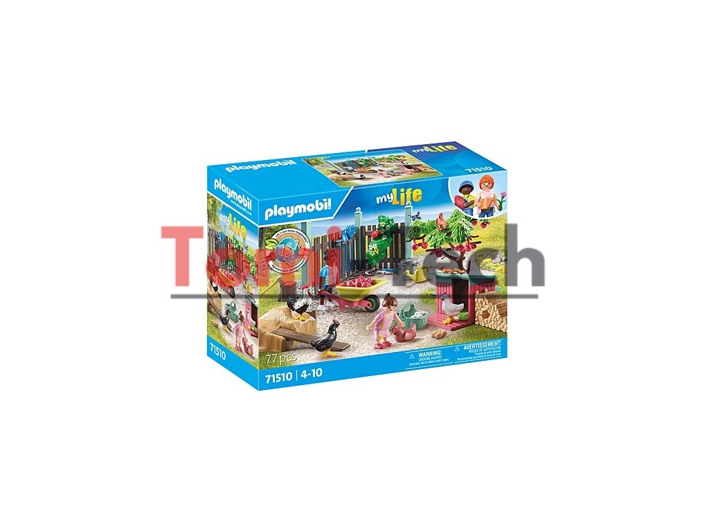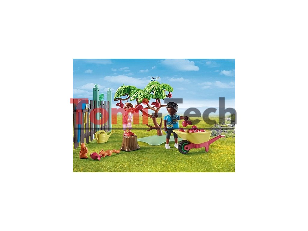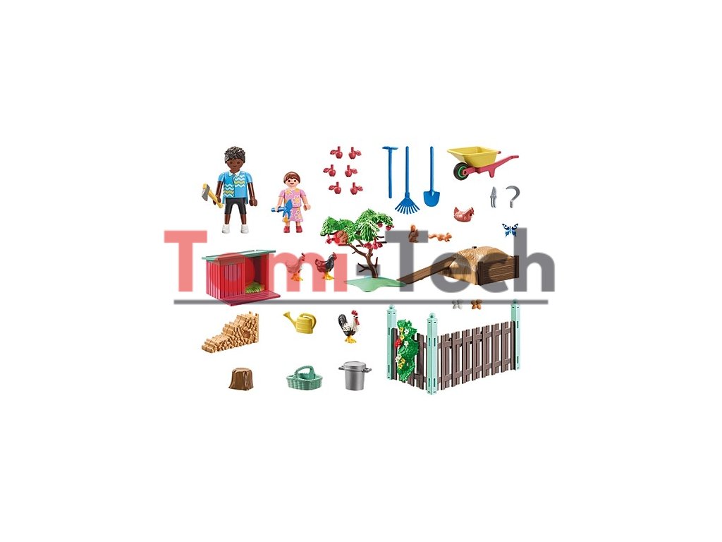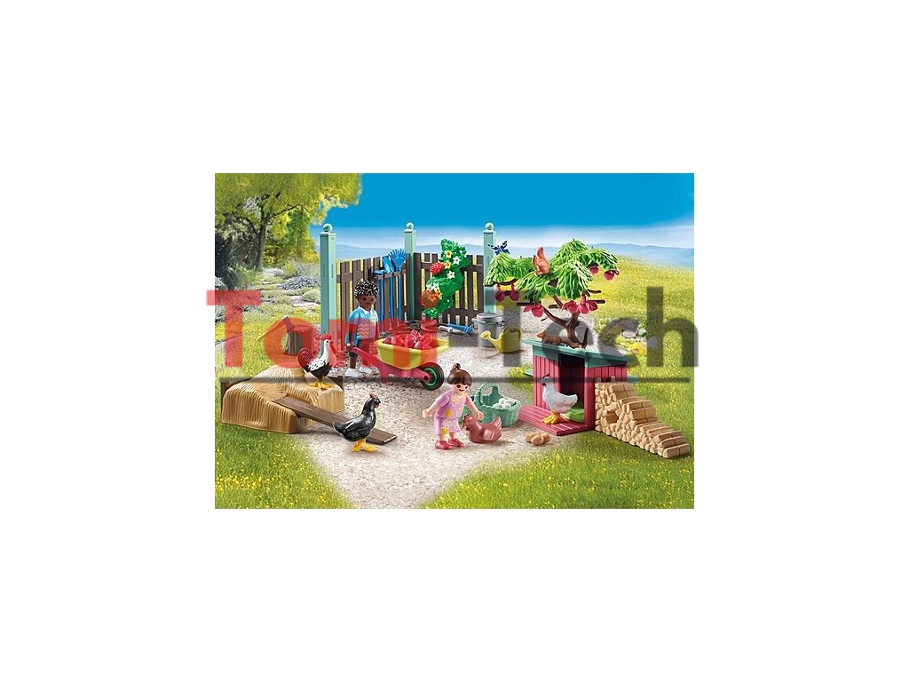 - Bohato vybavená sada s dvoma figúrkami PLAYMOBIL, kohútom a tromi sliepkami, veveričkami, kurínom, jabloňou a množstvom záhradného náradia pre zábavu pri hraní rolí.