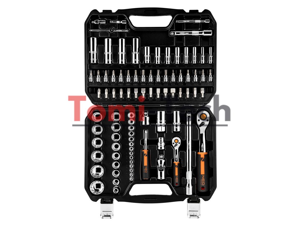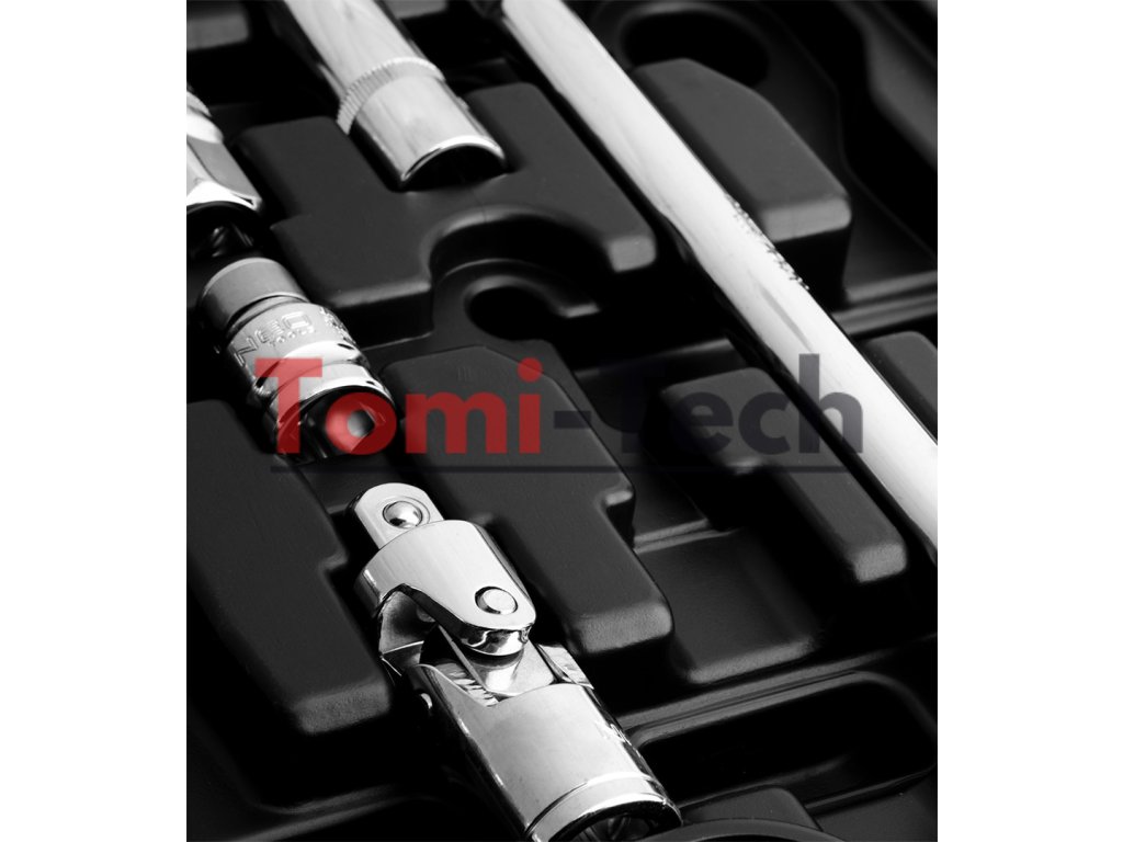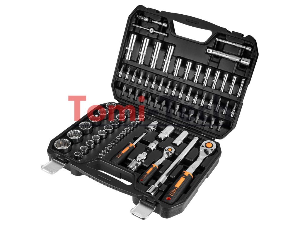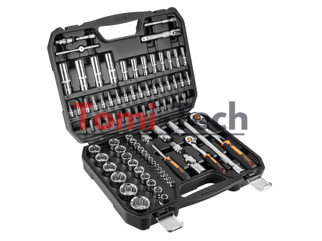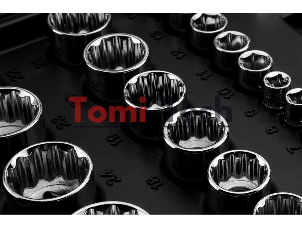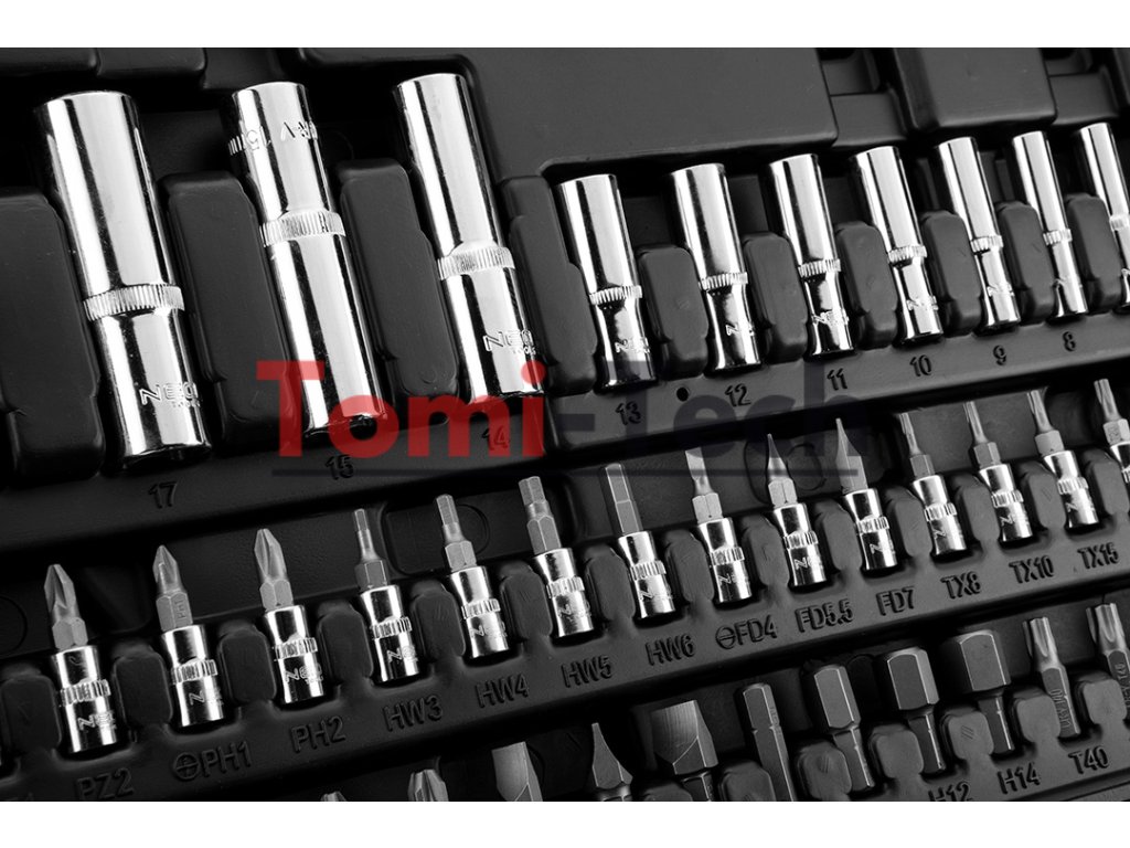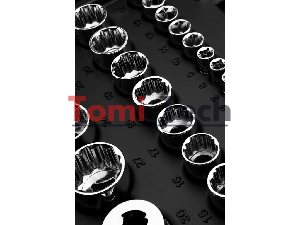Nástrčkové kľúče 86 ks, 1/2", 1/4", CrV oceľ, 15 ks dvanásťhranných nástrčných kľúčov 1/2": 10, 13, 15, 16, 17, 18, 19, 20, 21, 22, 23, 24, 27, 30, 32 mm, 4 ks dlhých šesťhranných nástrčných kľúčov 1/2": 14, 15, 17, 19 mm, račňová kľúč 1/2", 90 zubov, 2 ks predĺženia 1/2": 125 mm a 250 mm, 2 ks hlavíc na zapaľovacie sviečky 1/2": 16 mm a 21 mm, adaptér z bitov 1/2" na 5/16", univerzálny kĺb 1/2", adaptér 1/2", šesťhranné nástrčné kľúče 1/4" 14 ks: 4, 4,5, 5, 5,5 6, 6,5, 7, 8, 9, 10, 11, 12, 13, 14 mm, 1/4" dlhé šesťhranné objímky 8 ks.: 6, 7, 8, 9, 10, 11, 12, 13 mm, 1/4" račňová kľúč, 90 zubov, 1/4" držiak bitov, 1/4" T-rukoväť, 1/4" univerzálny kĺb, 1/4" predĺženia 2 ks.: 50 mm a 100 mm, bity na 1/4" objímkach 17 ks.: TX8, TX10, TX15, TX20, TX25, TX30, PH1, PH2, PZ1, PZ2, SL4, SL5.5, SL7, HEX3, HEX4, HEX5, HEX6, 5/16" bity 15 ks: TX40, TX45, TX50, TX55, HEX8, HEX10, HEX12, HEX14, PH3, PH4, PZ3, PZ4, SL8, SL10, SL12, 25-ročná záruka.Dodatočné parametre