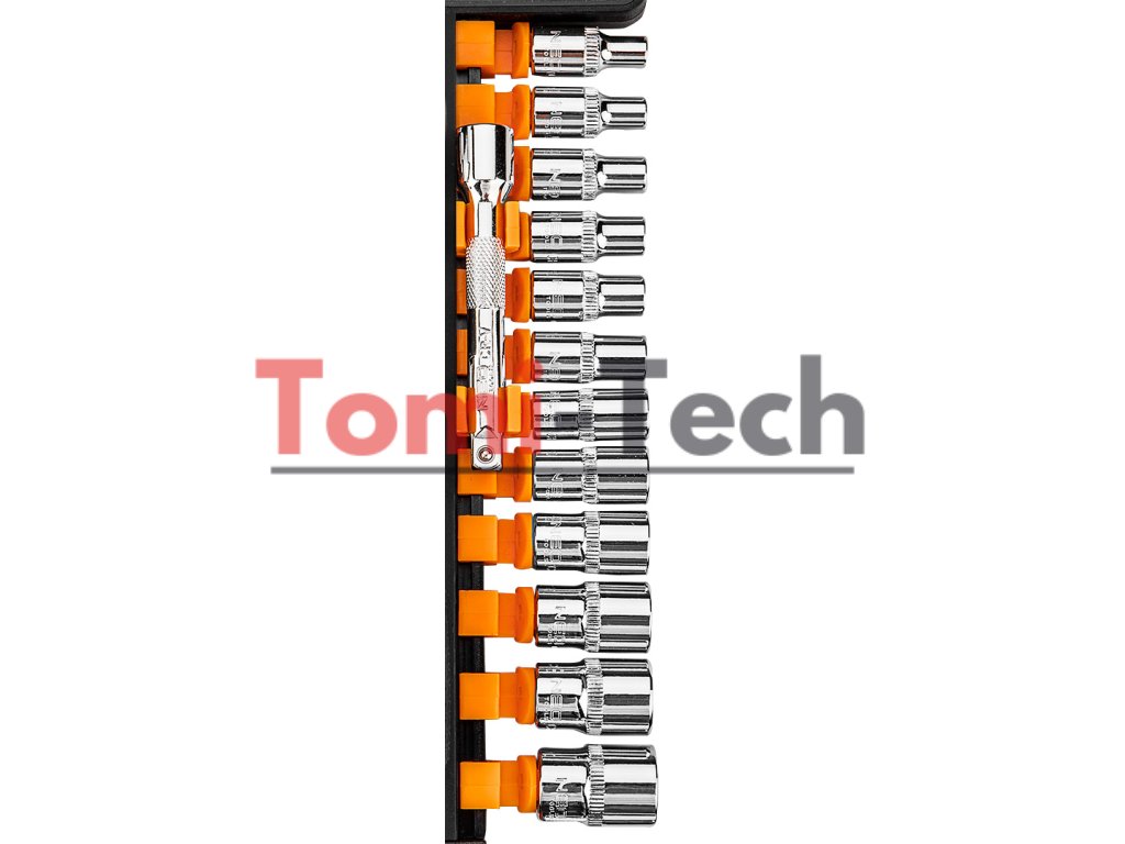 Nástrčkové kľúče 1/4", sada 14 kusov, 1/4": račňová 135 mm, dvojkomponentná rukoväť, 90 zubov, prepínač smeru otáčania, predĺženie 75 mm, 12 ks šesťhranných hlavíc, veľkosti: 4, 4,5, 5, 5,5, 6, 7, 8, 9, 10, 11, 12, 13 mm, plastový držiak, certifikát TÜV M+T, 25-ročná zárukaDodatočné parametre