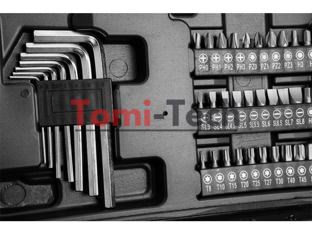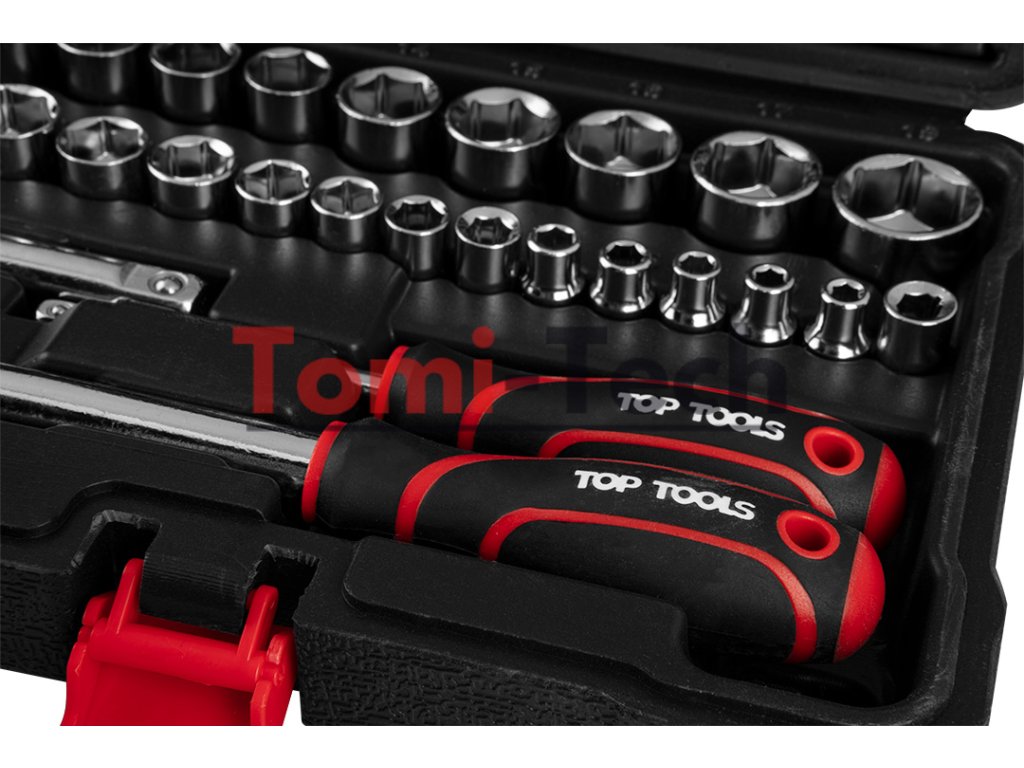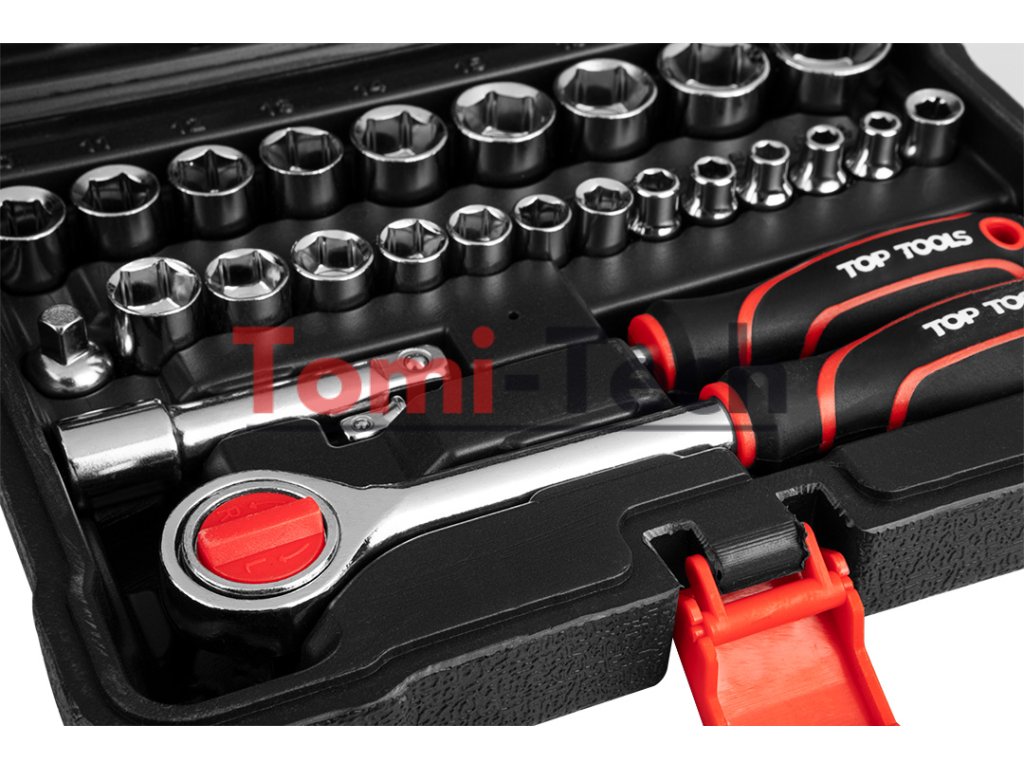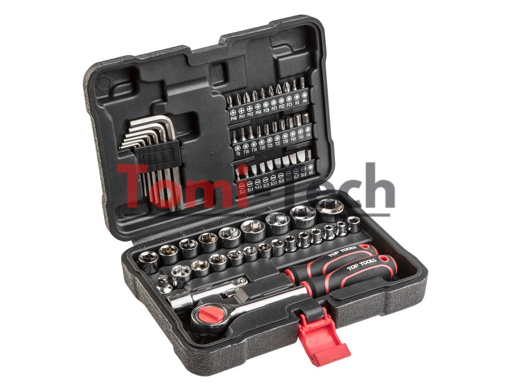 Sada objímkových kľúčov Top Tools (ref. 38D515), 3/8 63 ks. Materiál: uhlíková oceľ. Račňa 3/8, 9 ks šesťhranných objímok 3/8: 10, 11, 12, 13, 14, 15, 16, 17, 19 mm; 12 ks šesťhranných objímok: 4, 4,5, 5, 5,5, 6, 7, 8, 9, 10, 11, 12, 13 mm; predĺženie 3/8 70 mm, rukoväť skrutkovača, adaptér M x 3/8 F; adaptér na bit, 30 ks skrutkovacích bitov, 7 šesťhranných kľúčov s držiakom: 1,5, 2, 2,5, 3, 4, 5, 6 mm.Dodatočné parametre