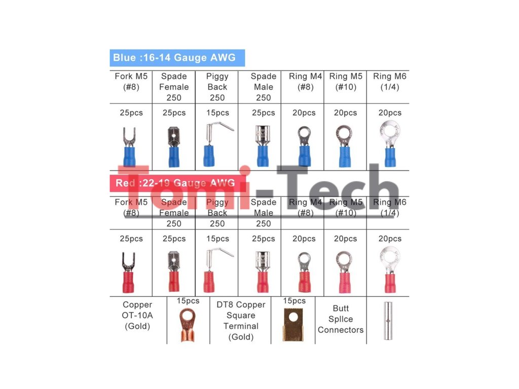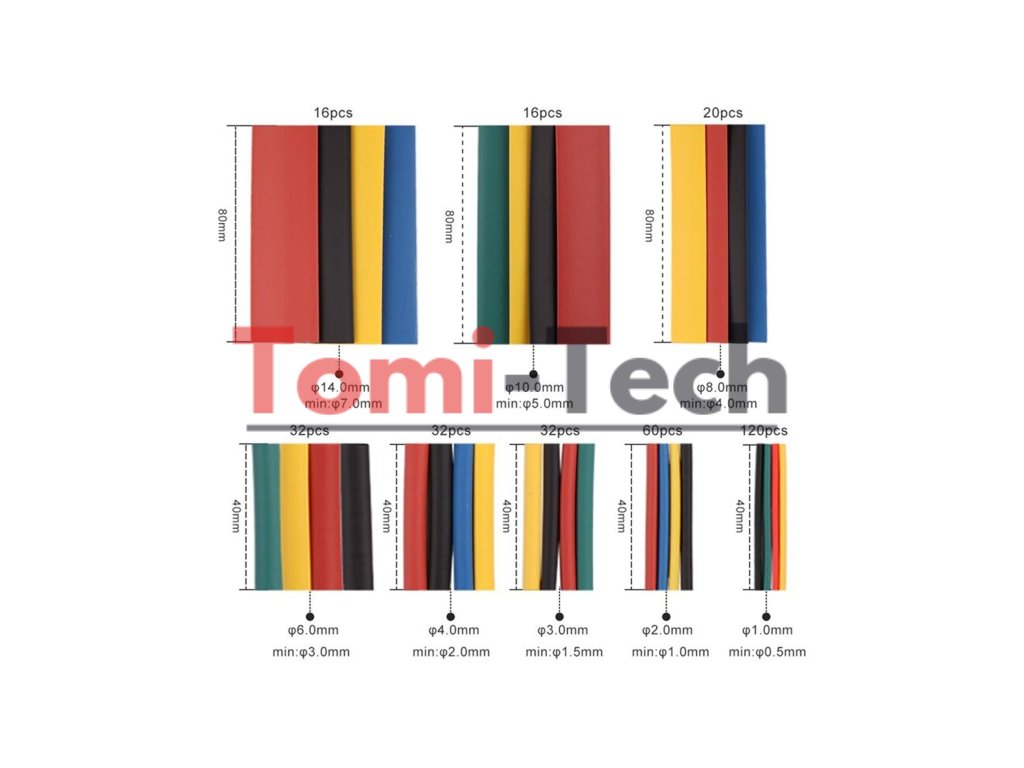 Sada konektorov a zmršťovacích bužírok 678 kusov. Sada 350 izolovaných konektorov plus 328 polyolefínových zmršťovacích bužírok. Produkt dodávaný v pevnom flexibilnom plastovom balení. Izolované krimpovacie konektory rôznych veľkostí. Balenie umožňuje vizuálnu kontrolu a zabraňuje zámene rôznych konektorov. Popis položky: Materiál: PVC + meď. Skladovacia krabica: plast. Napätie: 600 V. Sada 328 zmršťovacích bužírok. Veľmi pevný? Polyolefínový materiál Pomer zmršťovania: 2:1 (maximálne zmrštenie na 1/2 dodávaného priemeru) Minimálna teplota zmršťovania: ≤84 °C Teplota úplného zmršťovania: ≤120 °C Prevádzková teplota: -55 °C až +125 °C Pevnosť v ťahu: 10,4 MPa Elektrická pevnosť: 15 KV/mm Výrobná špecifikácia: ISO9001 Horľavosť: Spomaľovač horenia Spôsob rezania: Nožnice alebo ostrý nôžDodatočné parametre