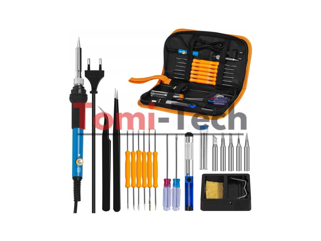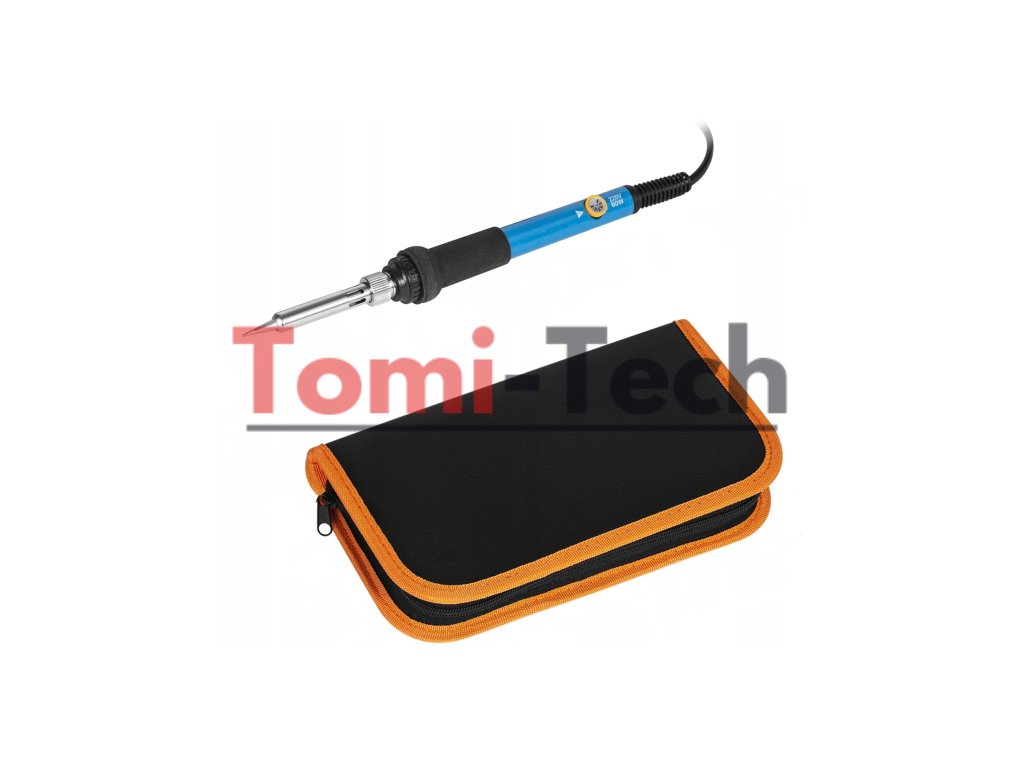 SPÁJOVAČKA + PRÍSLUŠENSTVO V PUZDRE. Táto sada spájkovačky a príslušenstva je ideálna na spájkovanie stredne veľkých elektronických súčiastok. Ľahko vymeniteľné hroty vám umožnia rýchlo si ju prispôsobiť vašim potrebám. Splní očakávania domácich majstrov aj skúsených servisných technikov. Jej pevná konštrukcia a vyvážený dizajn zabezpečujú vysoký komfort práce. Sada obsahuje: 60W spájkovačku s vymeniteľnými hrotmi s reguláciou teploty od 200 do 450 °C, hliníkový extraktor spájky, ampulku s spájkou, stojan na spájkovačku, sadu 5 náhradných hrotov s rôznymi tvarmi hrotov, pinzetu a puzdro na prepravu a skladovanie nástrojov.Dodatočné parametre