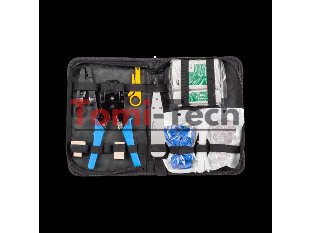 9-dielna sada pre sieť LAN + kufor. Sada nástrojov na budovanie počítačových sietí: krimpovacie kliešte RJ9 RJ11 RJ12 RJ45, vstavané odizolovacie a rezacie kliešte, rázový nástroj typu KRONE (vyšší model), odizolovacie kliešte s krimpovacím hrotom pre zásuvky KRONE LSA, tester RJ9 RJ11 RJ12 RJ45, 20 zástrčiek RJ45, 20 krytov zástrčiek, sada 20 káblových zväzkov, rozbočovač RJ45, valec RJ45 a kufor. Táto sada je určená pre profesionálov aj domácich používateľov.Dodatočné parametre