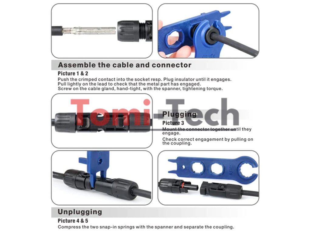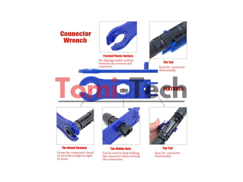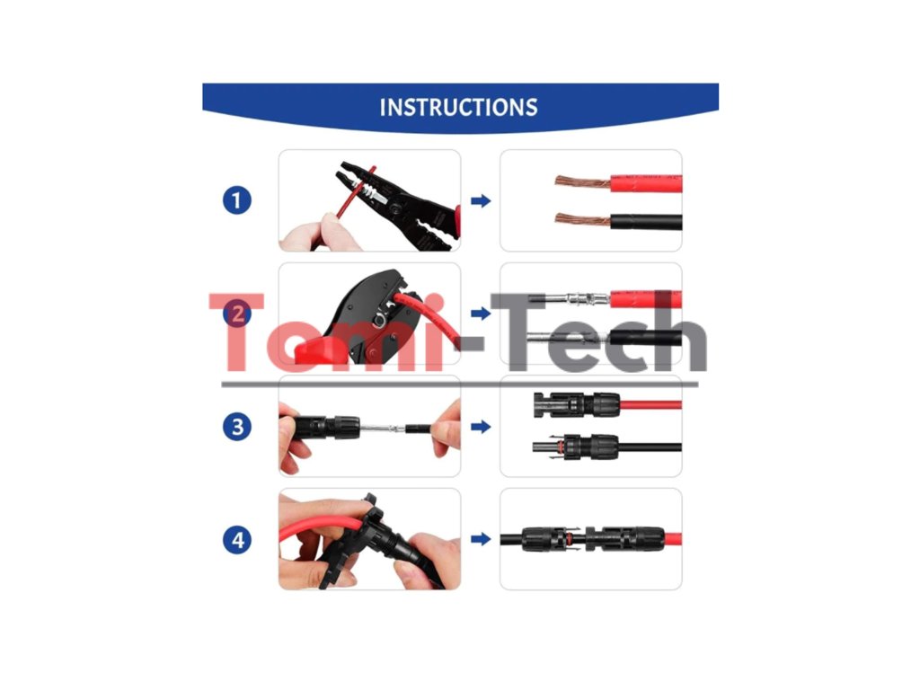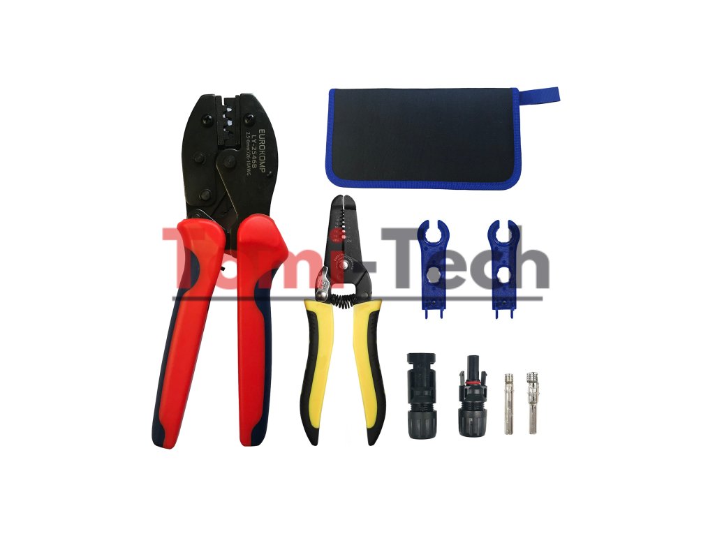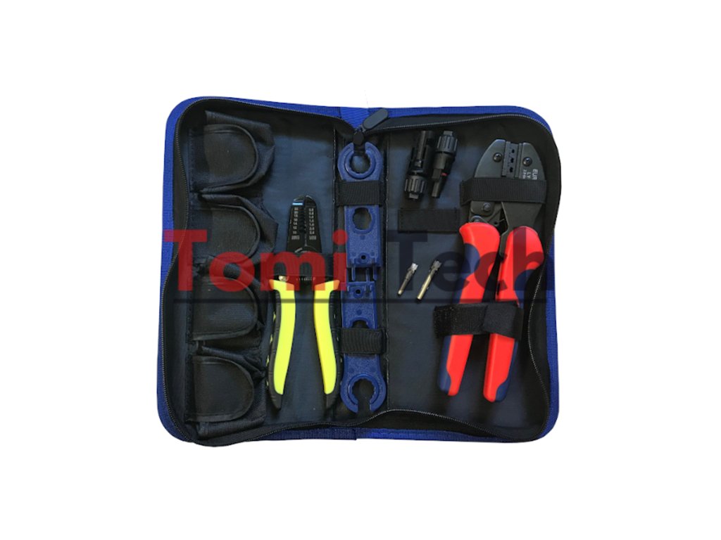 Sada robustného náradia kompatibilného s konektormi MC4 a najobľúbenejšou kabelážou používanou vo fotovoltaike. Toto náradie je ideálne na vytváranie fotovoltaických inštalácií. Umožňuje vám vykonávať všetky potrebné úlohy súvisiace s inštaláciou konektorov a pripájaním vodičov. Zaisťuje bezpečnú a rýchlu prácu. Sada obsahuje: krimpovacie kliešte na konektory MC4, odizolovacie kliešte na káble, 2 kľúče na konektory MC4, konektory MC4 (zásuvka + zástrčka), skladovacie a prepravné puzdro. Krimpovacie kliešte na solárne konektory MC4 2,5 – 6 mm². Tieto ručné krimpovacie kliešte sú určené na bezpečné a efektívne krimpovanie solárnych konektorov MC4 (samec aj samica) na viacžilových medených vodičoch. Sú vybavené tromi nezávislými zásuvkami. Pracovný rozsah: 2,5 / 4 / 6 mm2 Materiál: nástrojová oceľ Dĺžka: 220 mm Hmotnosť: 500 g Račňový krimpovací systém (automaticky sa uvoľňuje) Kalené závitové čeľuste zaistené skrutkami proti vypadnutiu Pohodlná rukoväť zaisťujúca vhodný pracovný komfort Krimpovací proces vyžaduje malú silu Odizolovacie kliešte na káble 0,9-5,5 mm2 Kliešte určené na odizolovanie jednožilových káblov (drôtové, lankové) alebo jednotlivých žíl viacžilových káblov. Pracovný rozsah: 0,9 - 5,5 mm2 (18-10 AWG) Materiál: nástrojová oceľ Dĺžka: 170 mm Hmotnosť: 120 g Odnímateľná pružina odľahčuje ruku a uľahčuje prácu Ergonomická rukoväť zaručuje vhodný pracovný komfort Zaisťuje presné strihanie bez poškodenia jadra kábla Vybavené nožnicami Sériové solárne konektory MC4 2 ks (zásuvka + zástrčka) Konektory typu MC4 (samec a samica) určené na použitie na solárnych kábloch. Umožňujú profesionálne pripojenie fotovoltaických panelov a zabezpečujú stabilné a bezpečné pripojenie. Menovité napätie: 1000 VDC Maximálny prúd: 30A Typ kontaktu: valcový konektor ≥4 mm² Prierez vodiča: 4/6 mm2 (12/10 AWG) Odpor kontaktu: <0,5 m² Izolačný materiál: PPO (polypropylén) Pripojenie kábla: svorka Trieda bezpečnosti: II Stupeň ochrany: IP67 (po pripojení) Prevádzková teplota: (-40 °C) - (+85 °C) Praktické puzdro so 4 ďalšími vreckami Puzdro pomáha udržiavať poriadok a chráni náradie pred zlomením alebo poškodením.Dodatočné parametre